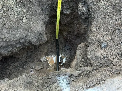 Initial excavation site with measurement being taken of the excavation depth.