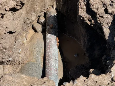 Ground broken with a section of pipeline exposed.