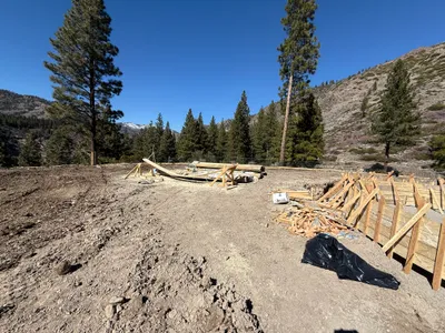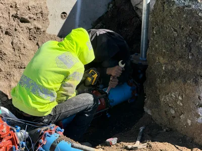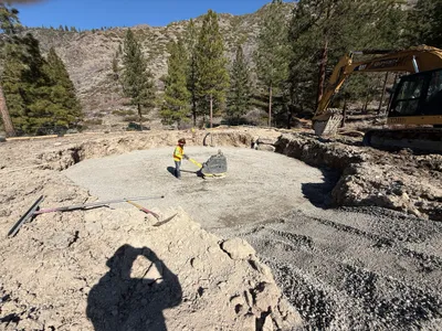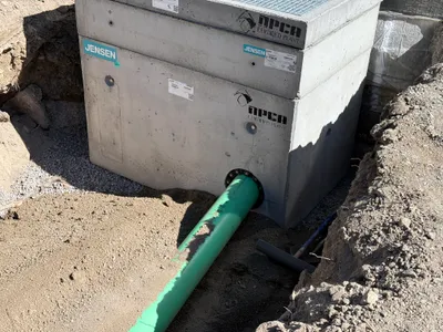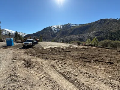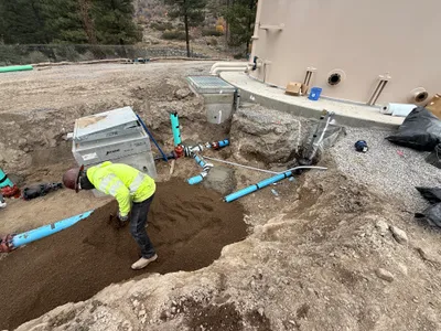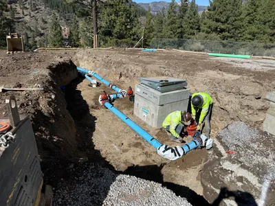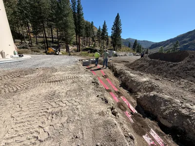 Infrastructure installed with trenches backfilled and utility connections nearing completion.