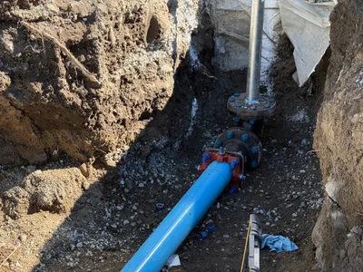 Blue pipes installed for utilities in the trench.