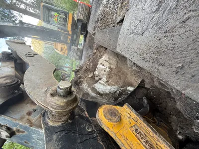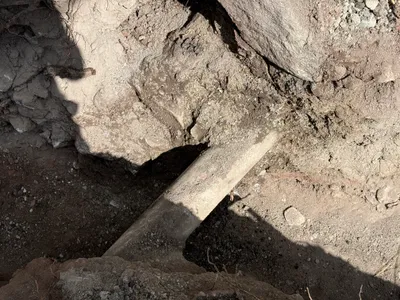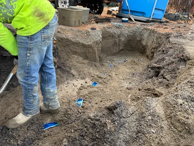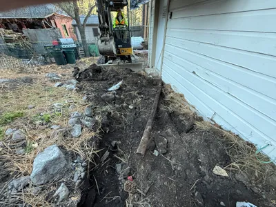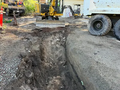 Trench partially open near a building, with some debris and earthwork visible.