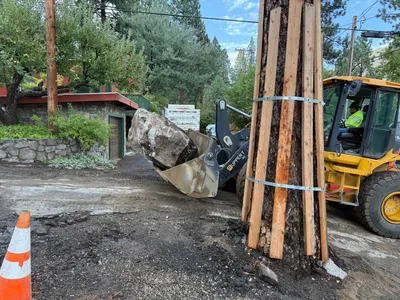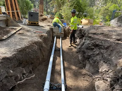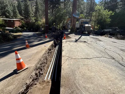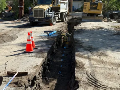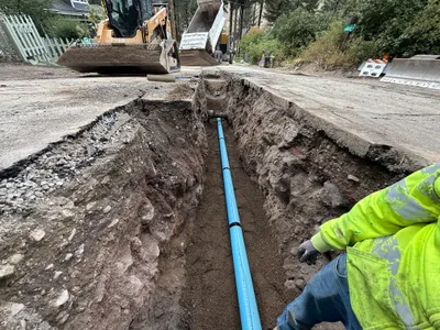 Trench excavation is visible, with trenching work in progress.