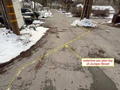 Snow-covered cracked pavement with a waterline marking.