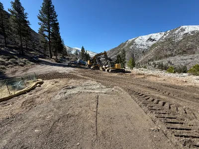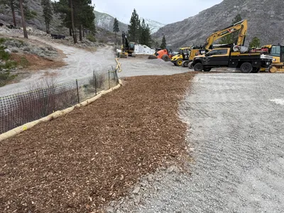 Large construction machinery is on site, indicating preparation for major earthmoving.