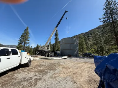Concrete tank sections and other materials onsite, indicating start of tank assembly.