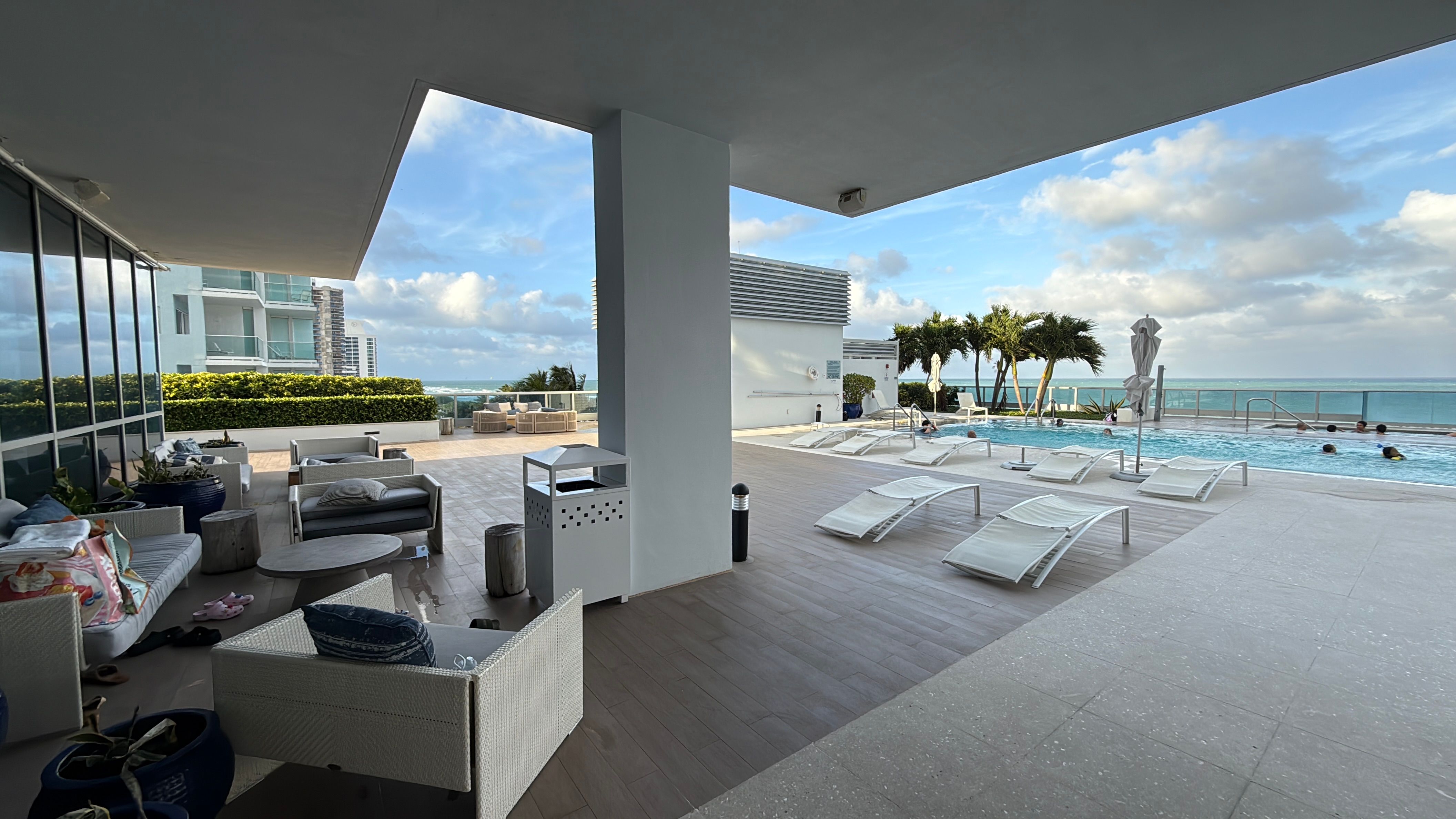 The photo shows a modern outdoor pool area with lounge chairs and seating, not related to construction activities or components. There are swimming people and a clear view of the ocean, indicating a recreational setting. No visible construction materials, machinery, or components related to water infrastructure are present.