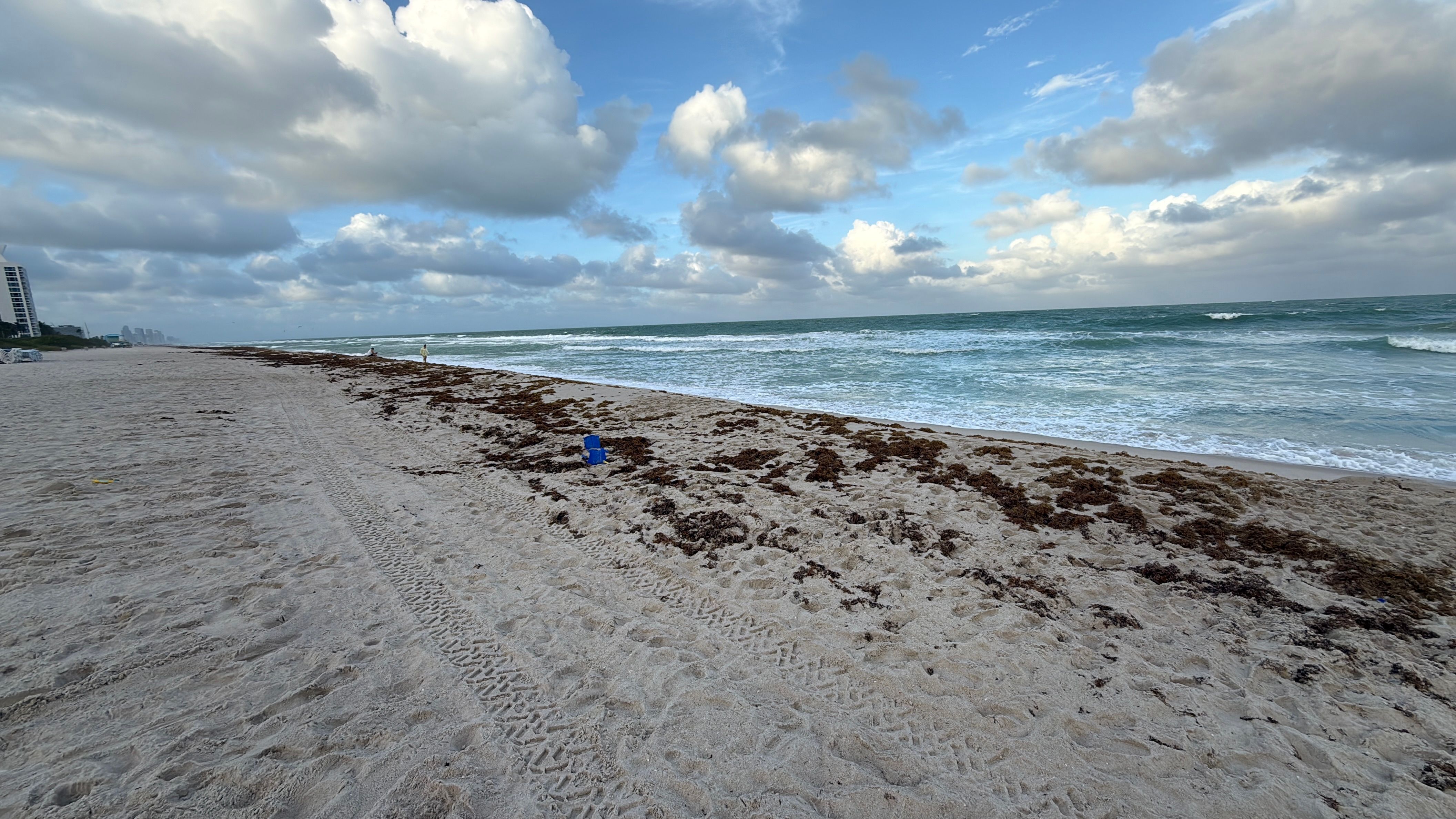 The photo shows a beachfront area with no visible active construction activities or infrastructure materials. Sand, seaweed, and ocean waves dominate the scene, with a track mark in the sand indicating possible movement of equipment or inspection vehicles. No construction stage or specific project components are apparent from this image.