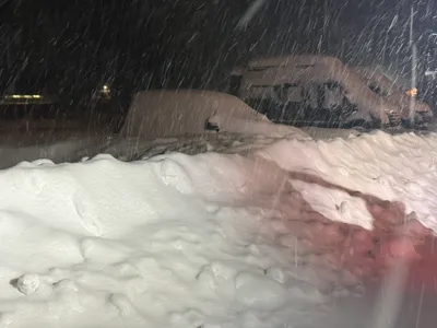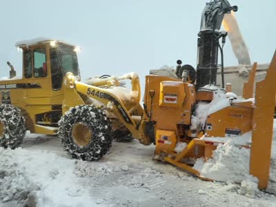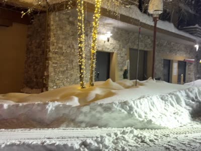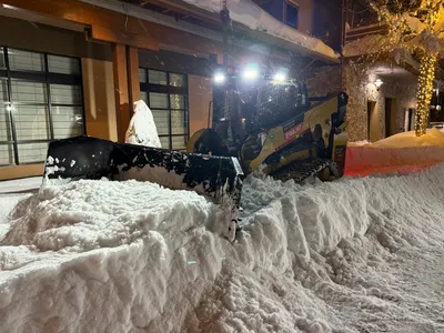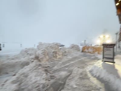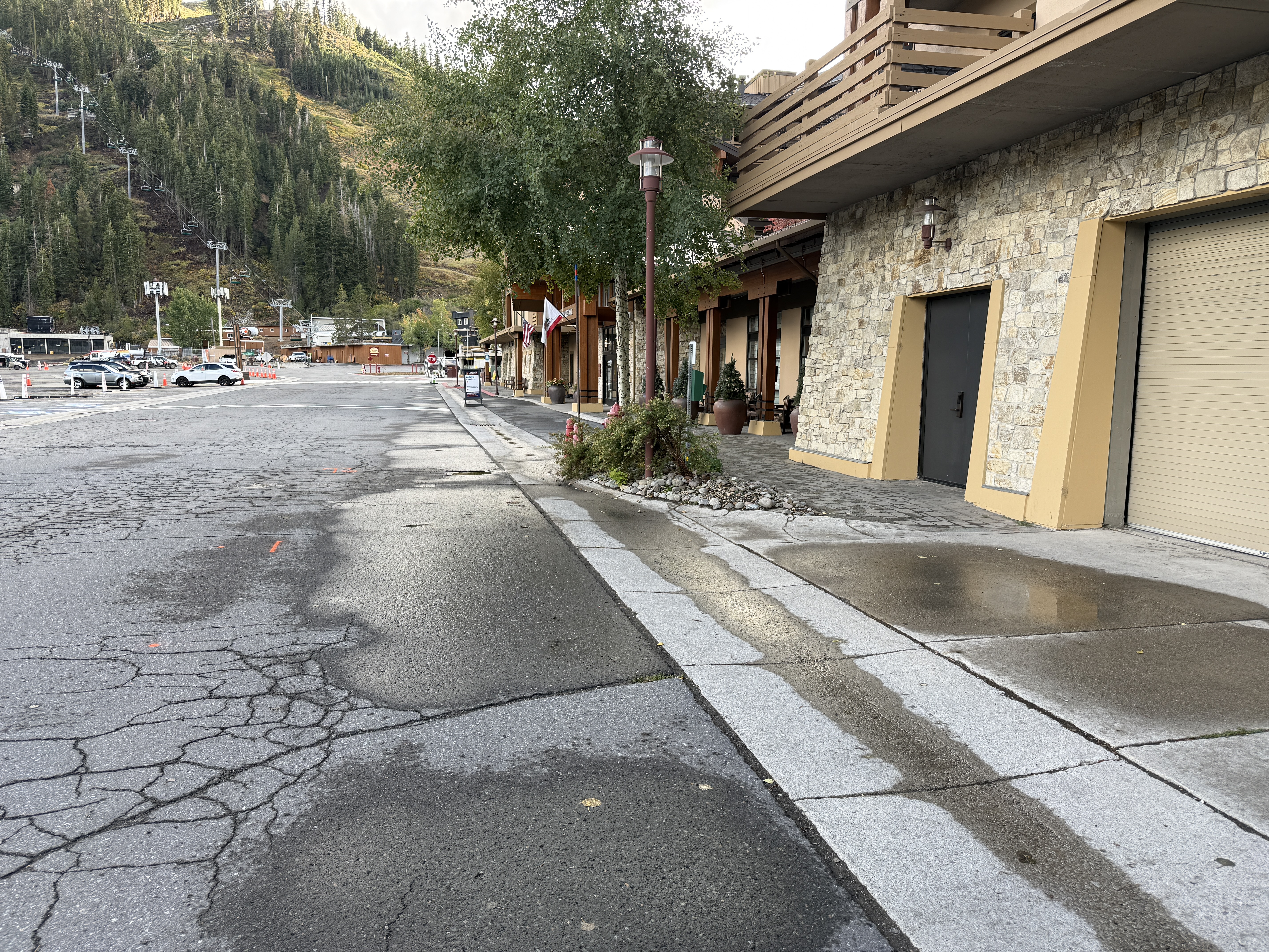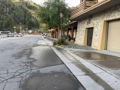 The photo shows a street adjacent to a building with a stone facade and a garage door. There is no visible construction activity, equipment, or personnel present. The street appears damp with visible cracks and has no visible construction materials.