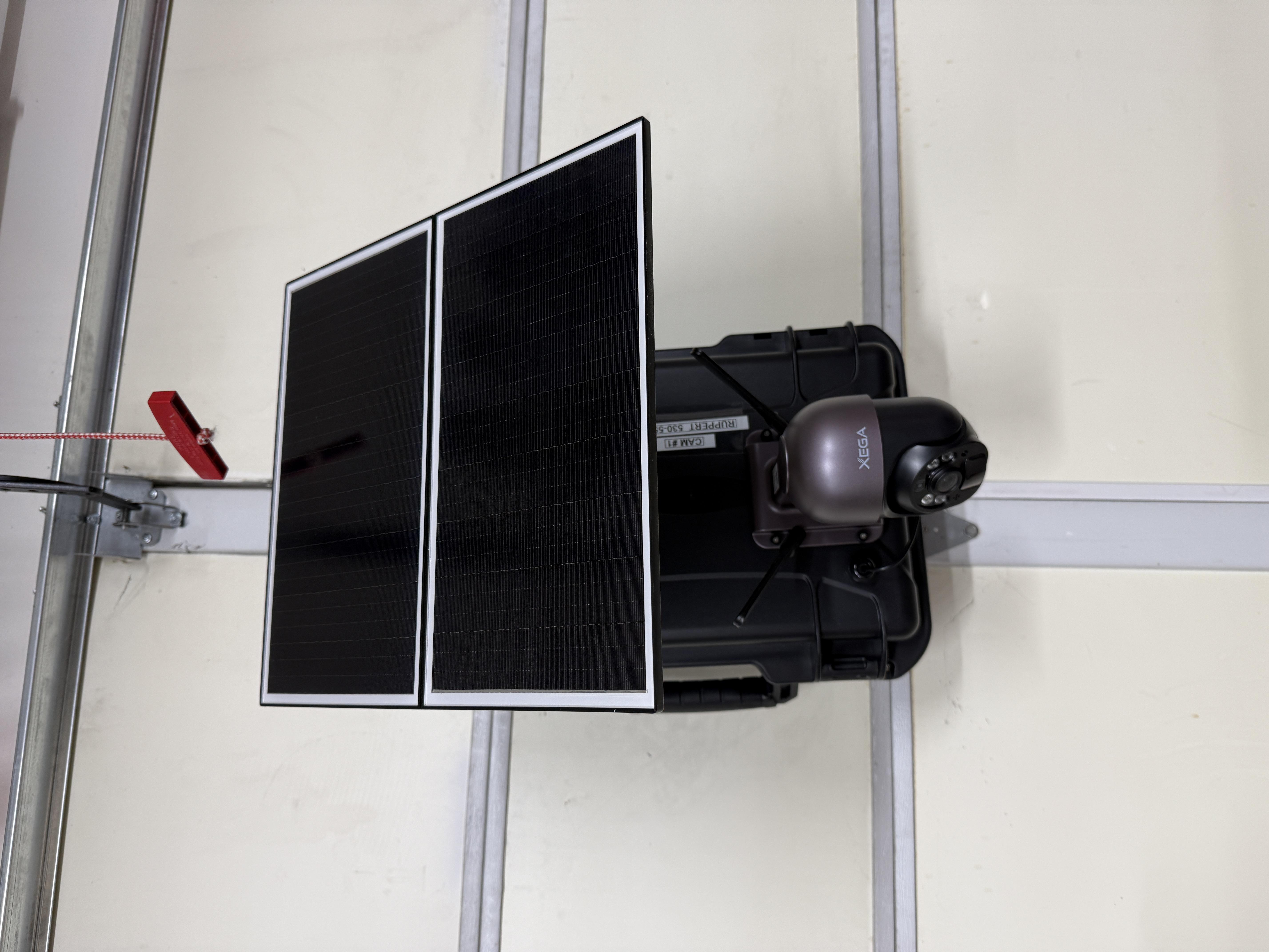 The image shows a solar-powered, 4G LTE camera installation. The camera is mounted on a wall, equipped with solar panels for power supply. This setup indicates a medium-term monitoring stage, likely to oversee a construction project remotely.