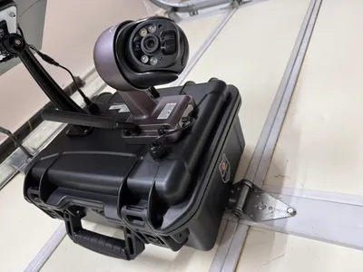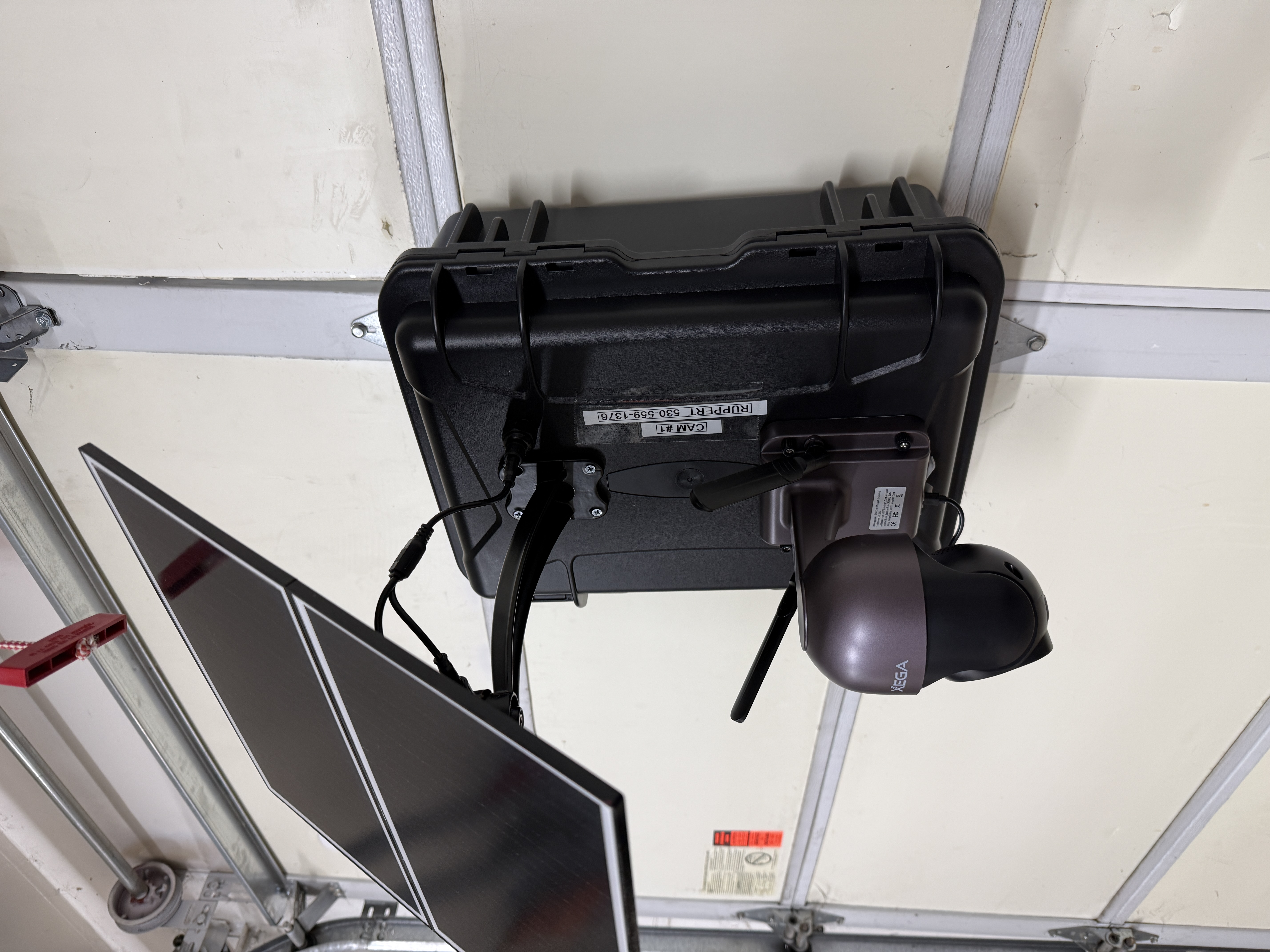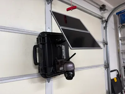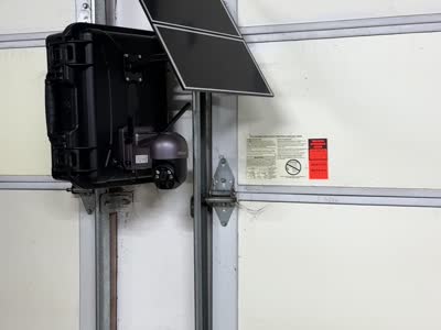 The image shows a mounted 4G LTE camera system with a solar panel attached for power, likely intended for remote monitoring at a construction site. The setup appears to be pre-installed on the wall, with the camera ready for surveillance activities. No construction activities are in progress, focusing instead on the observational or security infrastructure for the site.