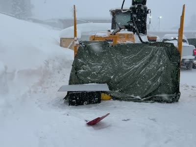 The video clip shows activity related to snow removal. An orange snow removal vehicle is present, covered partially by a green tarp, indicating preparation or protection from snow. Snow is visibly accumulating on equipment components throughout the frames, showing continuous snowfall during the recording.