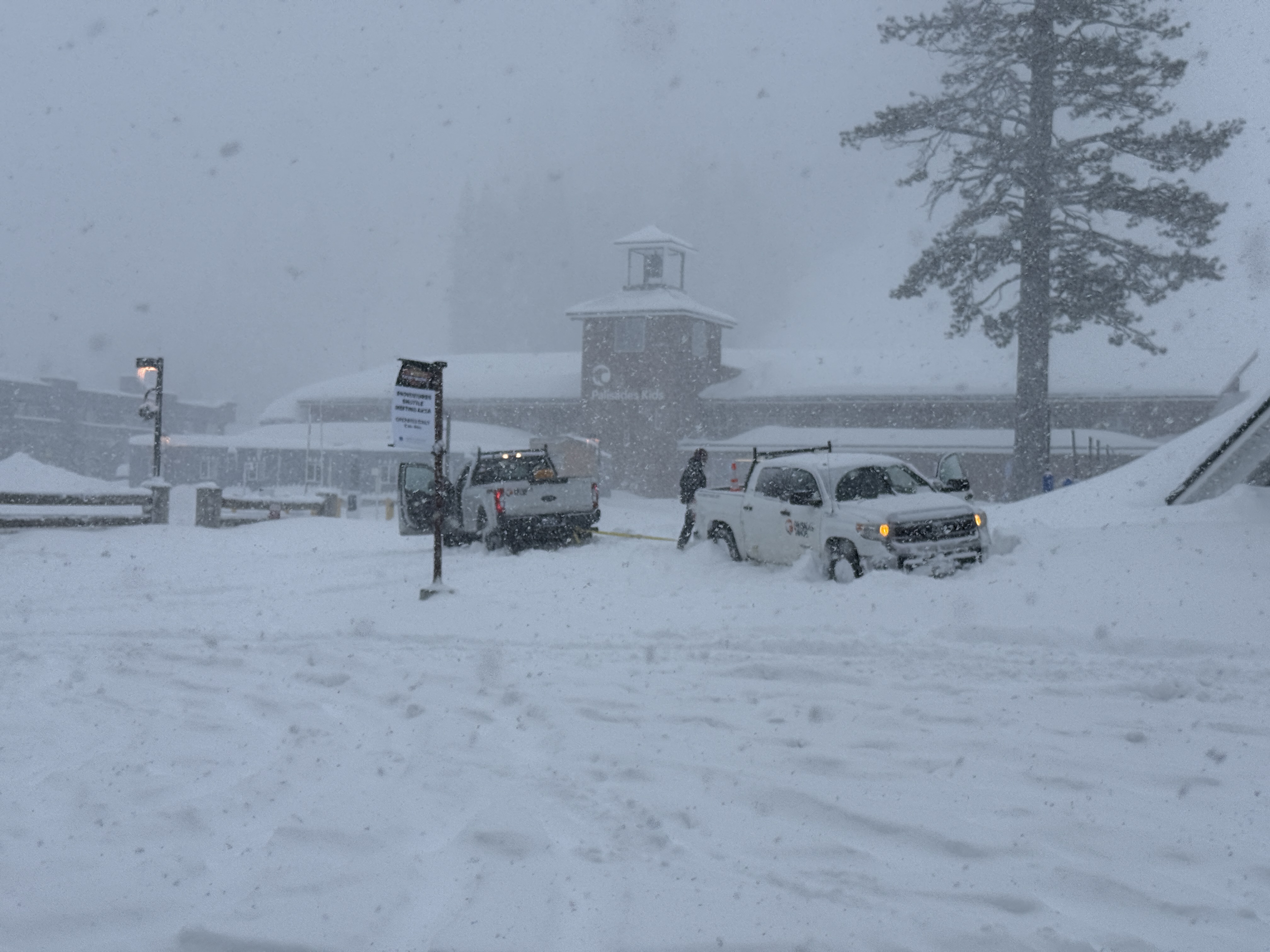 The image shows a snow-covered site where vehicles are involved in snow removal operations. A pickup truck is visible in the snow, with individuals likely engaged in removing snow to access the area or transport materials. The construction stage is unclear, but snow management is a primary activity.