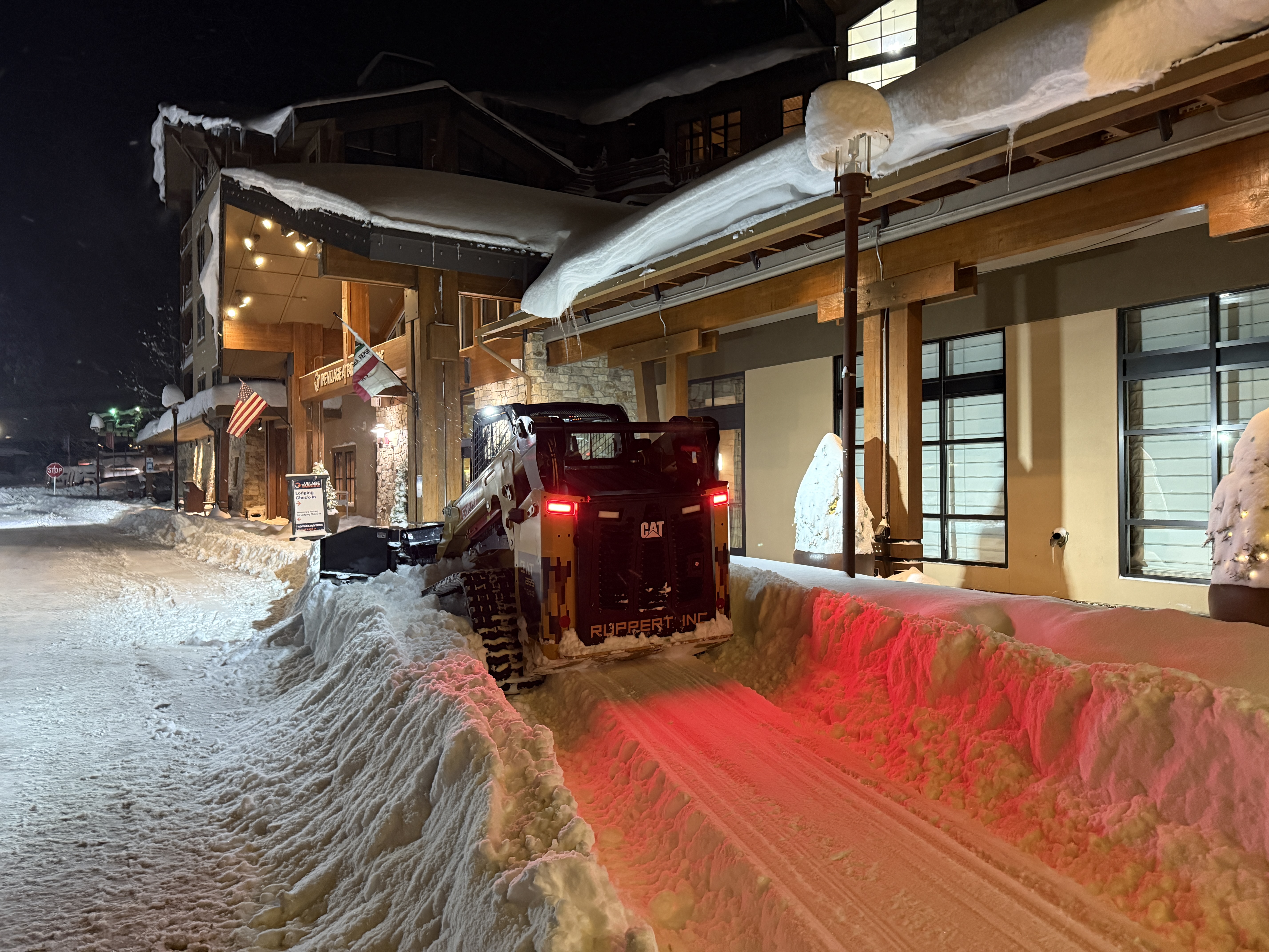 Construction phase not applicable; ground covered with snow, nighttime lighting conditions present, indicating proactive snow management.