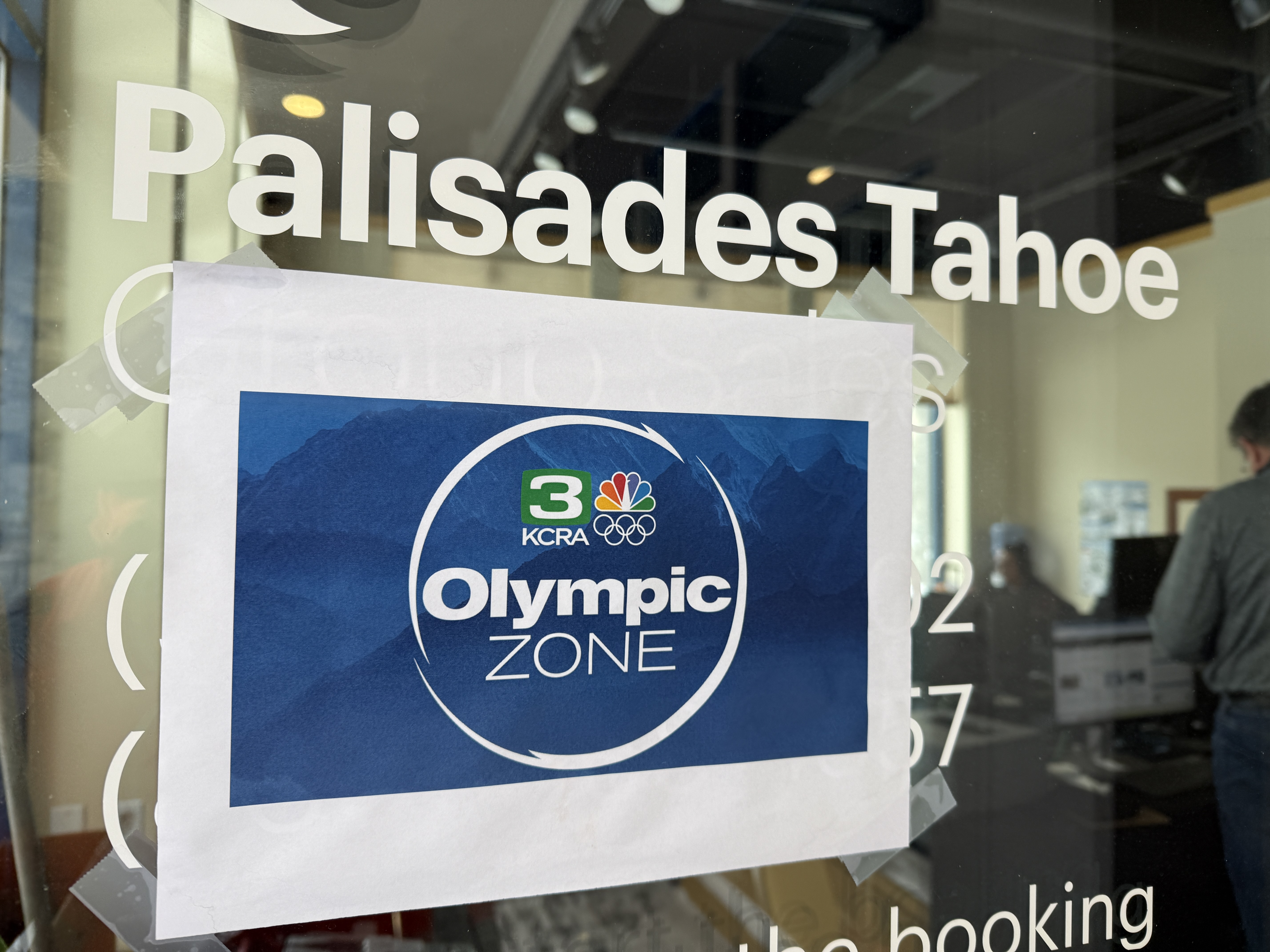 The image shows signage on a glass door at Palisades Tahoe, indicating an association with NBC's Olympic Zone. There are no visible construction activities, materials, or components related to water infrastructure construction in the image.