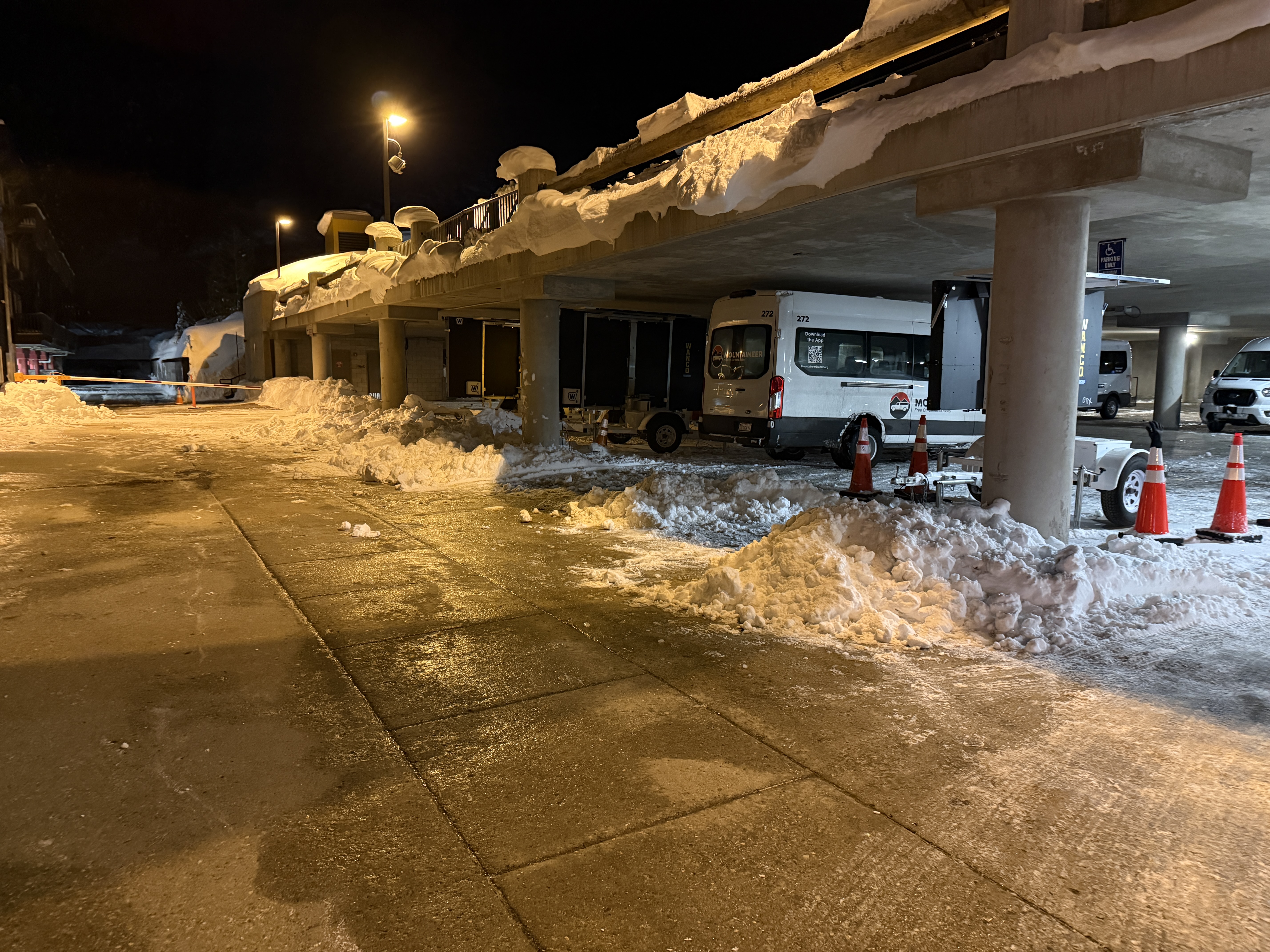 The image shows a snow removal operation under a covered area, likely a parking structure, at night. Snow is piled around the edges, and several vehicles, including vans and a trailer, are parked. The site appears to be in a maintenance stage with snow-clearing being the primary activity.