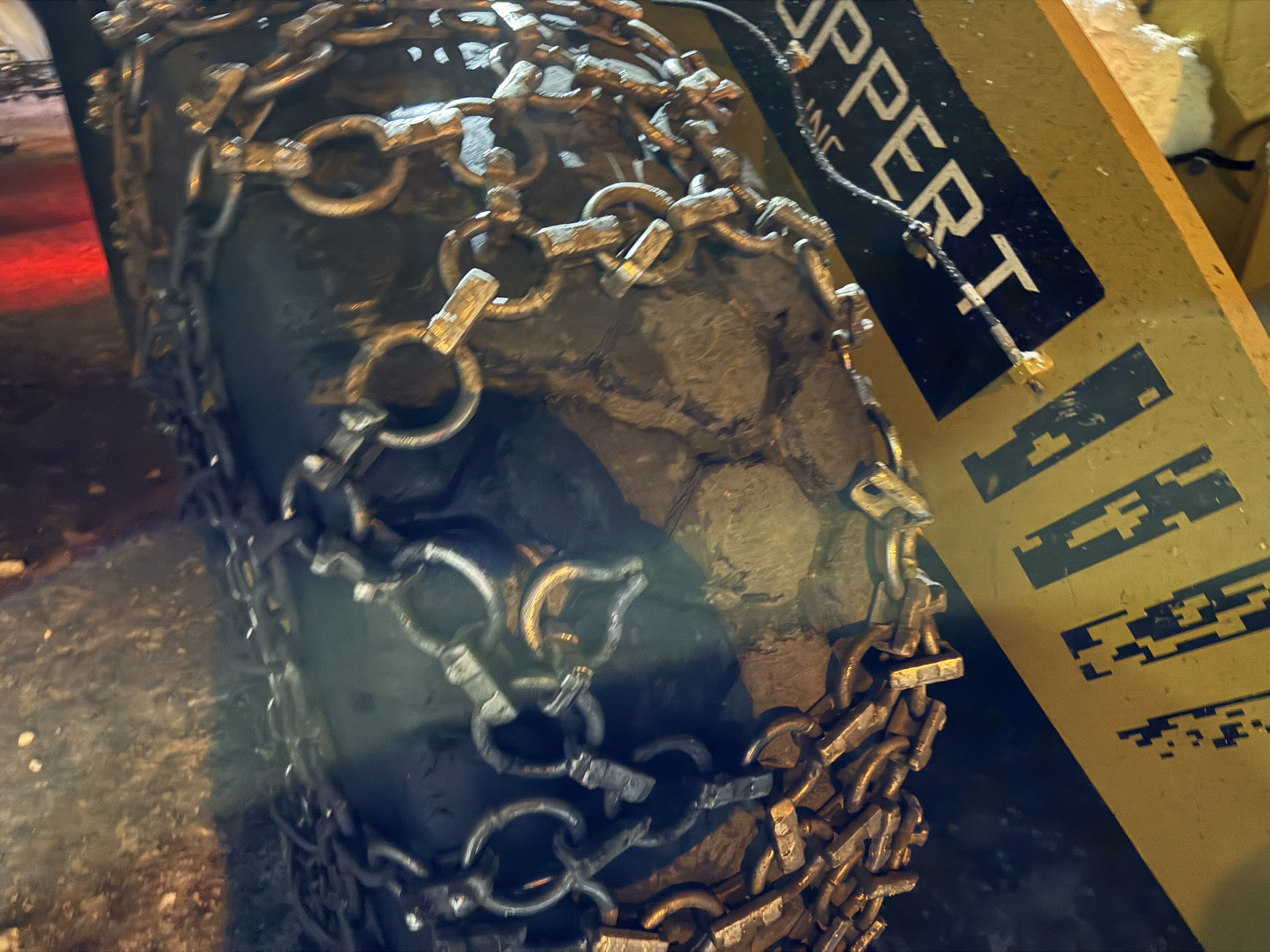 The image shows a large vehicle tire equipped with tire chains for traction, likely indicating operation in snowy or icy conditions. The chains are securely fitted around the tire, commonly used to enhance mobility on challenging terrains. The presence of a nearby sign suggests an organized construction setting.