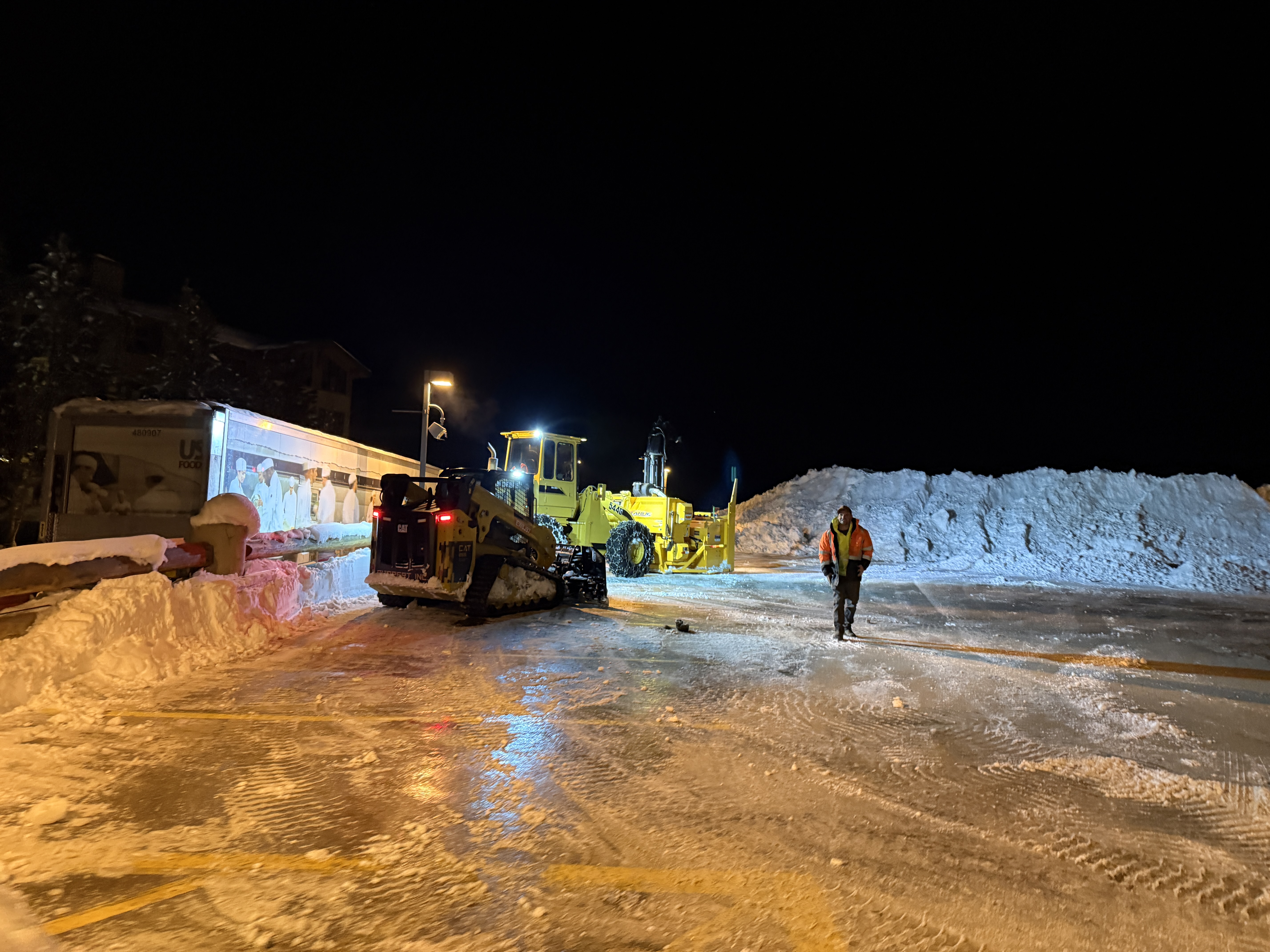 The photo shows snow removal operations underway at night in a parking area. A yellow snow plow and a CAT tracked skid steer are actively clearing snow. Large piles of snow are visible in the background, suggesting heavy accumulation. The site is well-lit, indicating night work conditions.