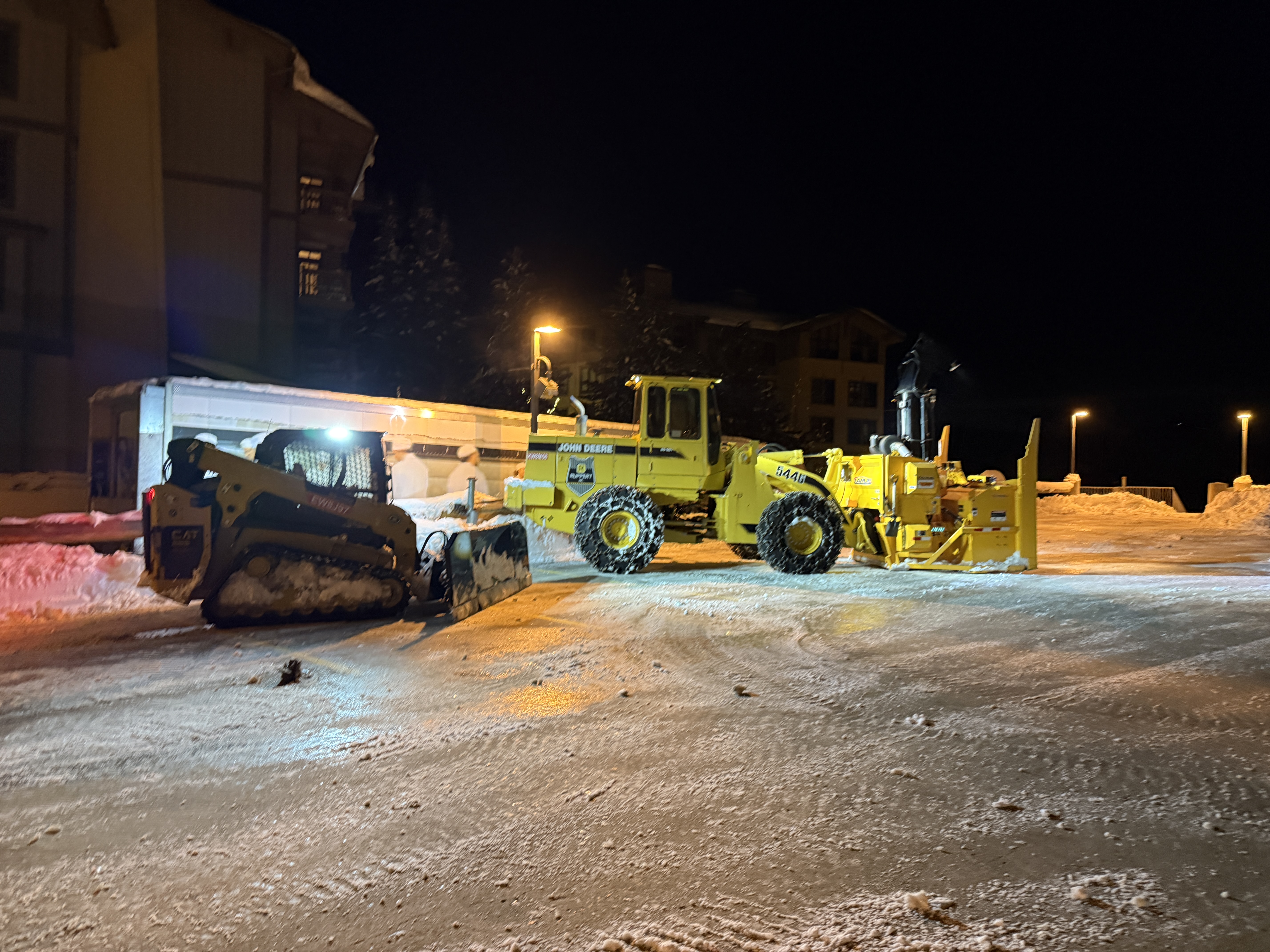 The image shows snow removal operations during nighttime, with two pieces of machinery clearing snow from a paved surface. A CAT skid steer is equipped with a snowplow attachment, while a larger yellow John Deere motor grader or snowplow is used to manage accumulated snow. The area appears well-lit, with streetlights and vehicle lights providing illumination, but no active water infrastructure construction activity is visible.