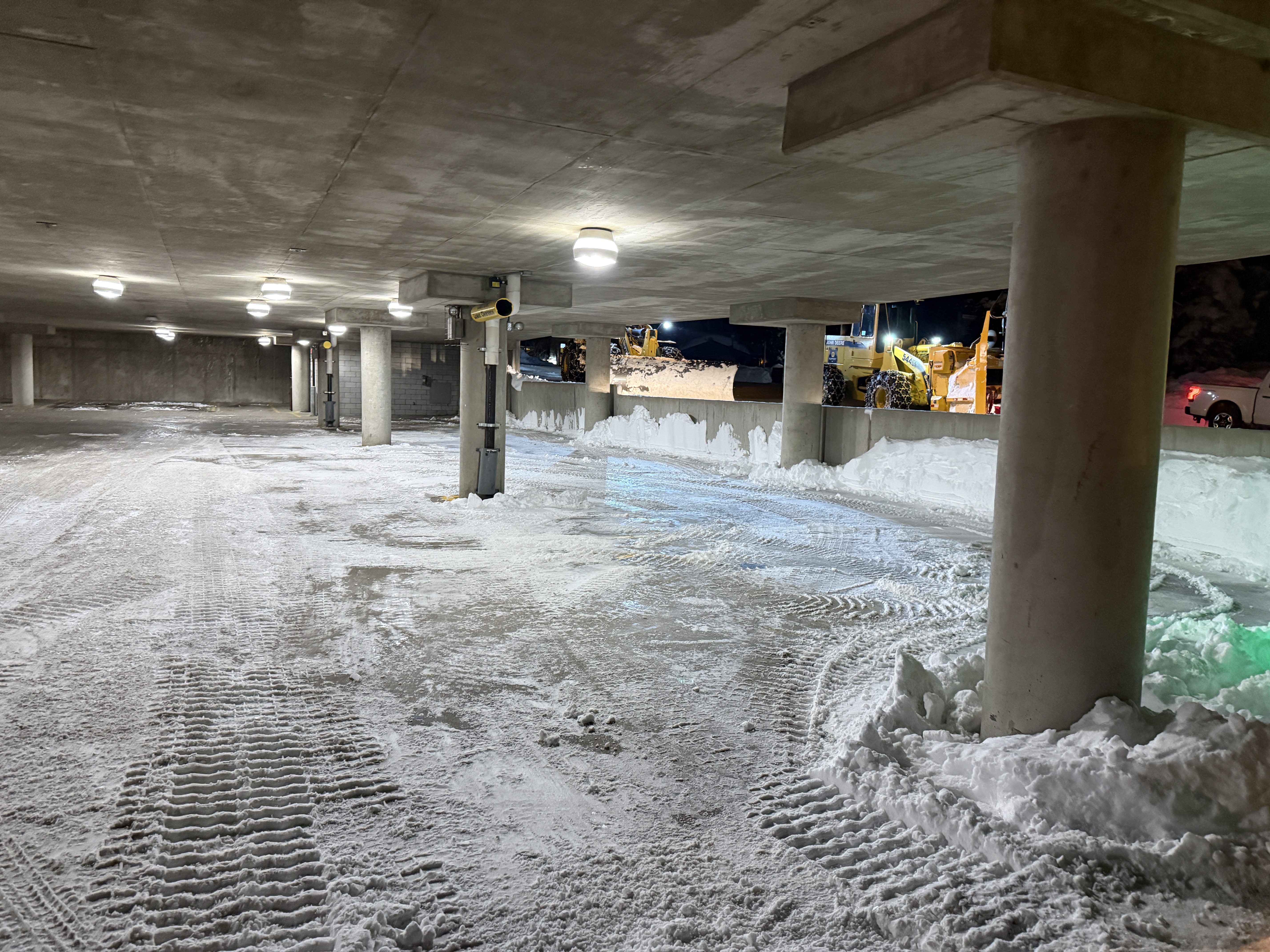 The photo depicts a snow-covered area within a concrete parking structure, illuminated by overhead lighting. Heavy equipment machinery is visible just outside the structure, apparently engaged in snow removal activities. The site appears to be primarily a maintenance operation focused on clearing snow, rather than active construction.