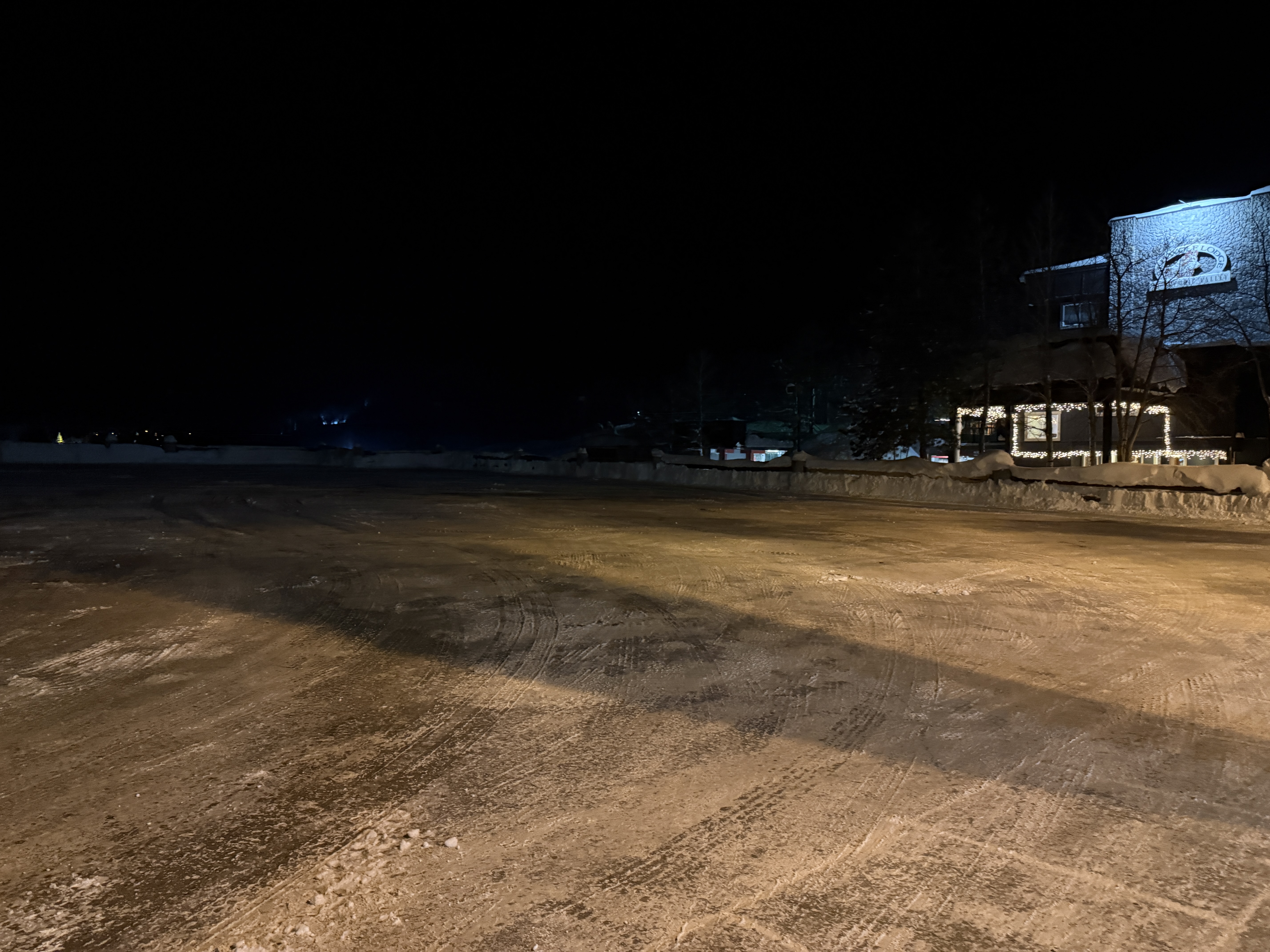 The photo shows a nighttime view of a snow-covered open area with a building illuminated by lights in the background. There is no visible construction activity, and the ground appears to be cleared of snow, suggesting recent snow removal operations.The terrain indicates a preparation or maintenance phase in the context of snow management.