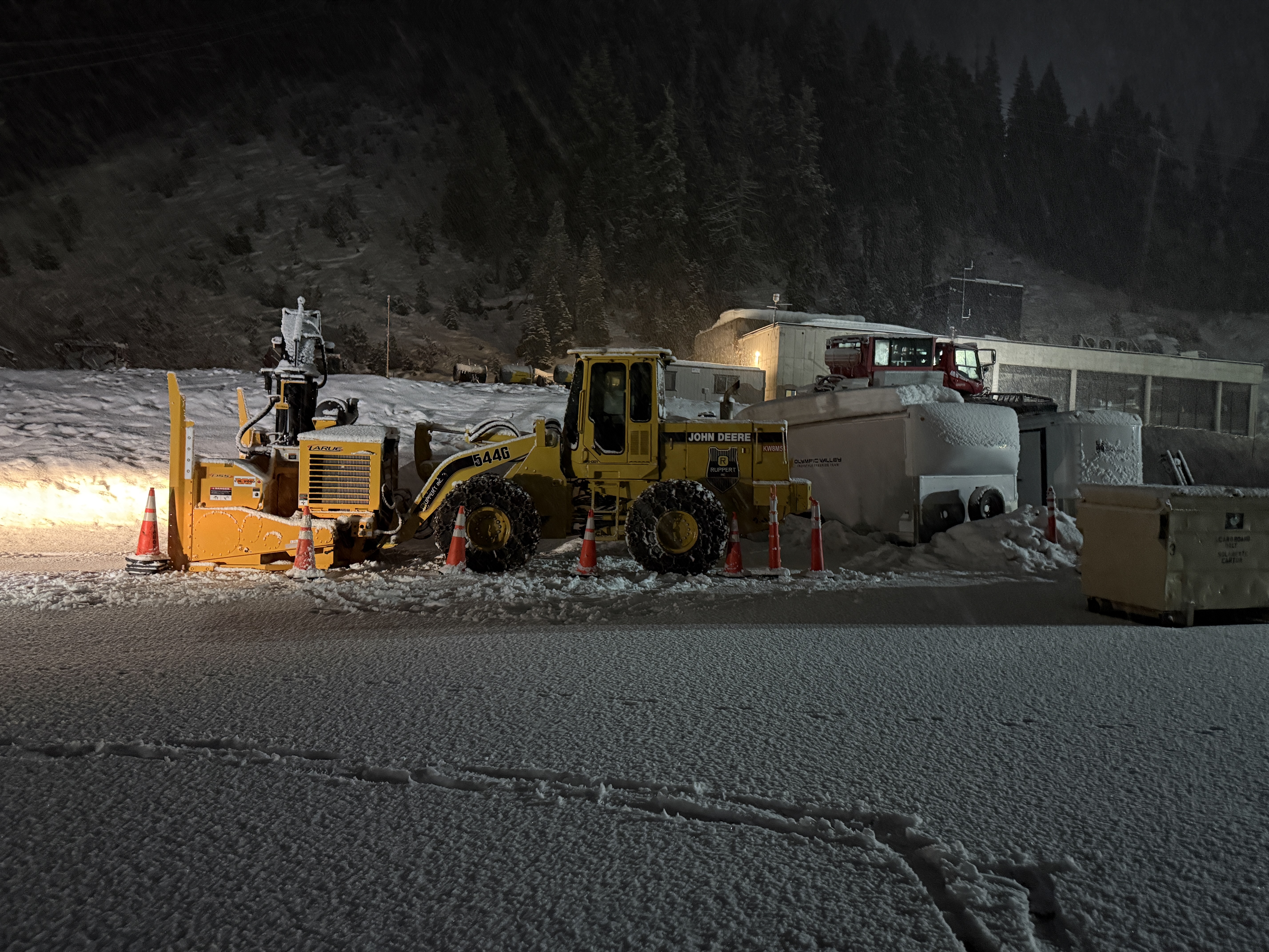 The site is in the early construction phase with snow-covered ground and nighttime lighting conditions. Equipment is staged and prepared for snow removal.