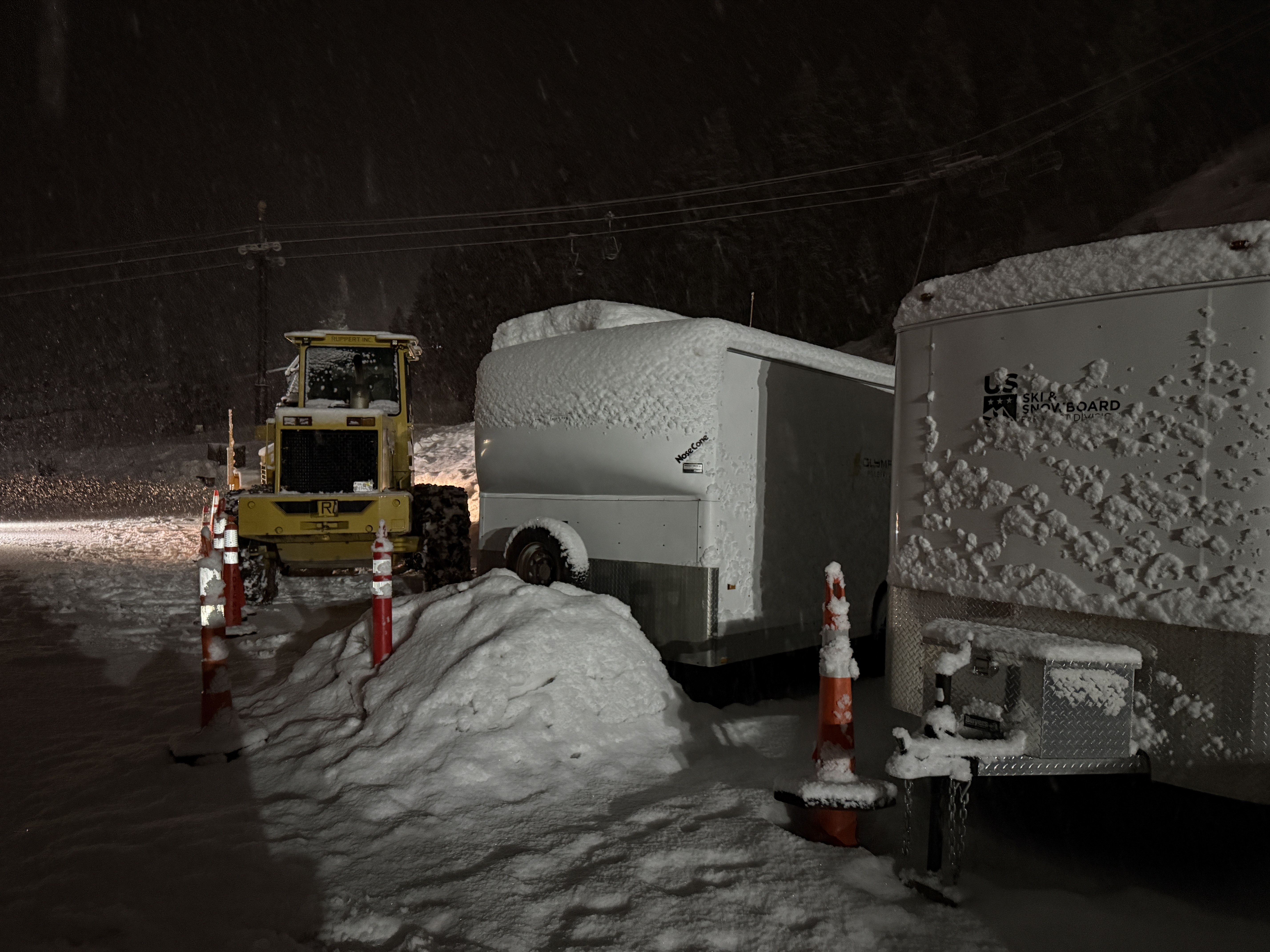 The image shows a snow-covered construction site during a snowstorm at night. A yellow snow plow is actively clearing snow from the site near utility trailers labeled for 'SKI & SNOWBOARD', indicating ongoing snow removal activities. The site appears to be in the early stages of preparation or maintenance work related to snow management.