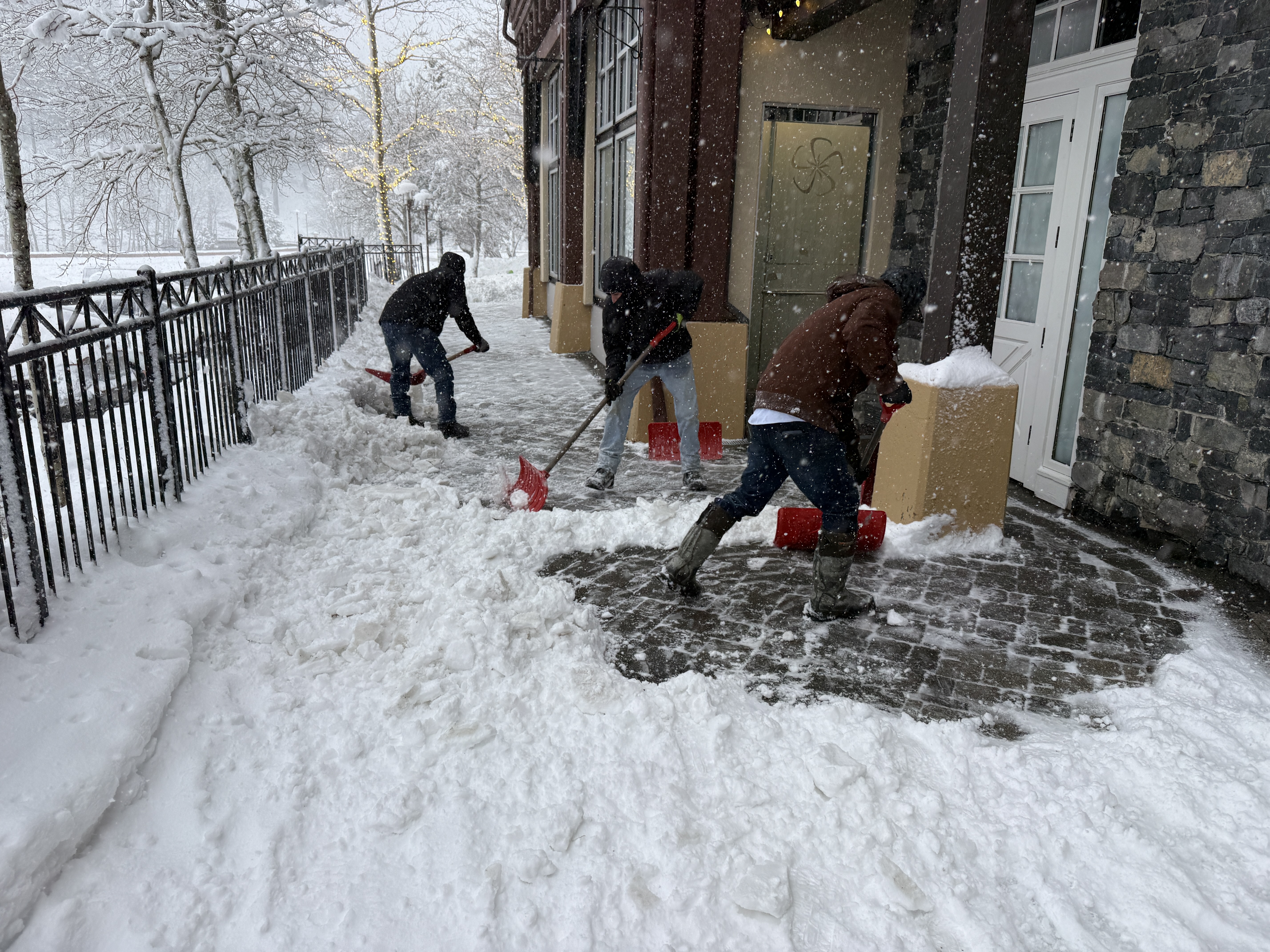 The image shows three individuals actively engaged in snow removal from a paved walkway using red snow shovels. The area is accumulating significant snow coverage due to ongoing snowfall, indicating challenging working conditions. The site is likely in an operational maintenance stage with no visible construction materials or components related to water infrastructure.