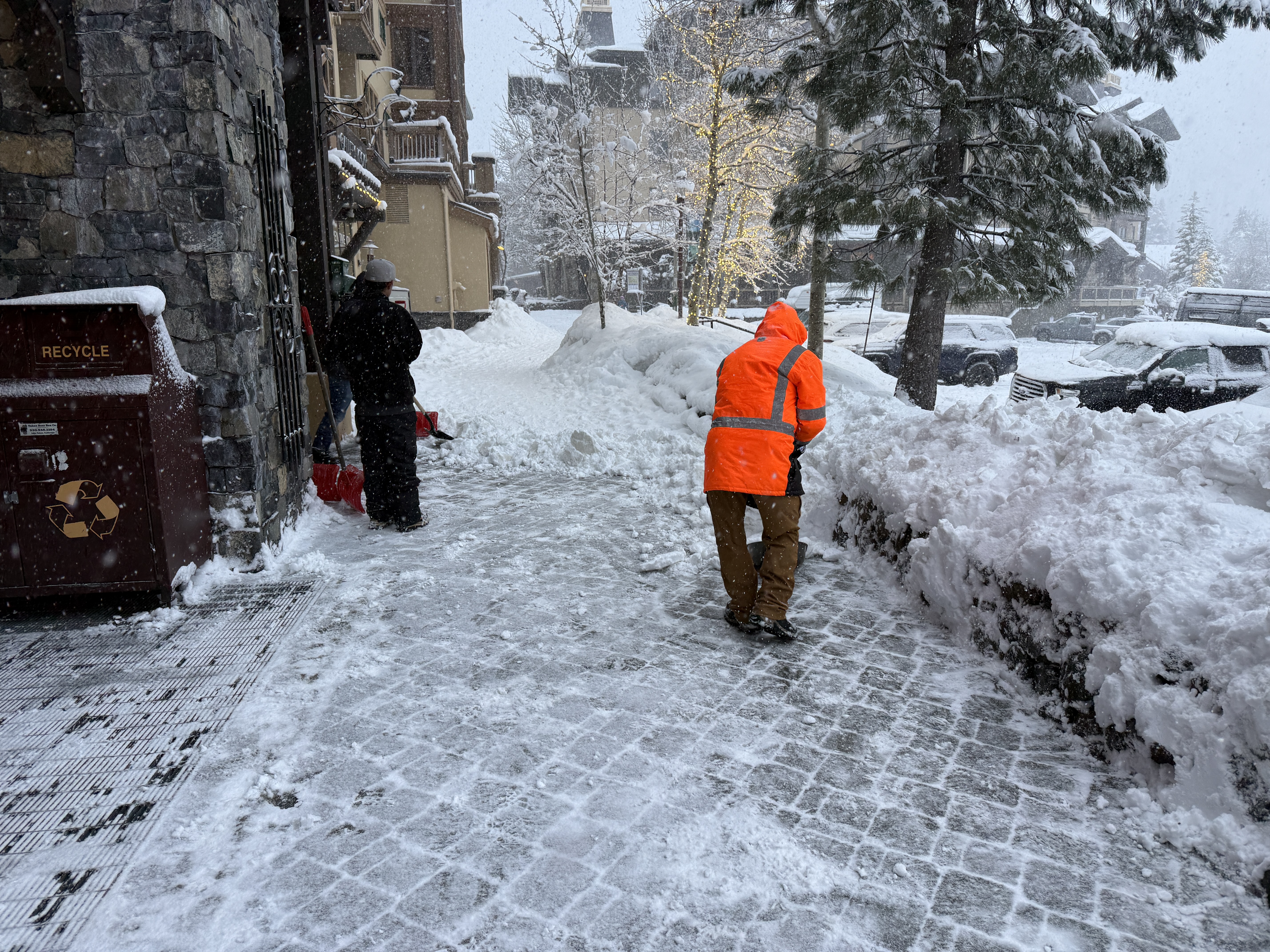 The image shows two individuals engaged in snow removal, with one person actively shoveling snow from a walkway. The area is surrounded by a significant accumulation of snow, indicating ongoing efforts to clear pathways. The snow removal activity appears to be during or immediately after a snowfall, suggesting a surface restoration task post-storm.