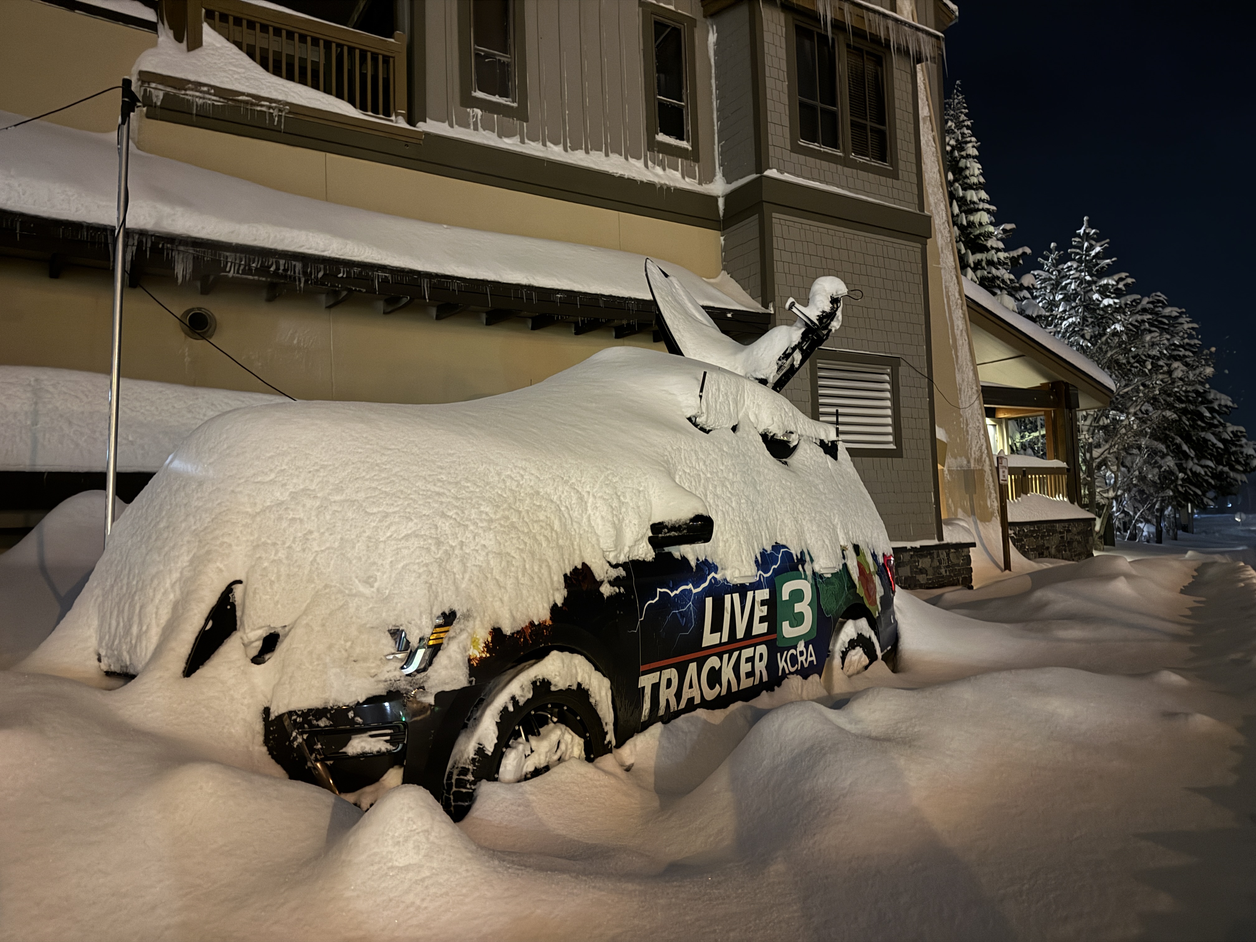 The photo shows a vehicle covered in heavy snowfall parked next to a building. The snow accumulation indicates severe winter conditions, possibly impacting construction activities. There is no visible construction work or equipment other than the vehicle, suggesting a pause in operations due to the storm.