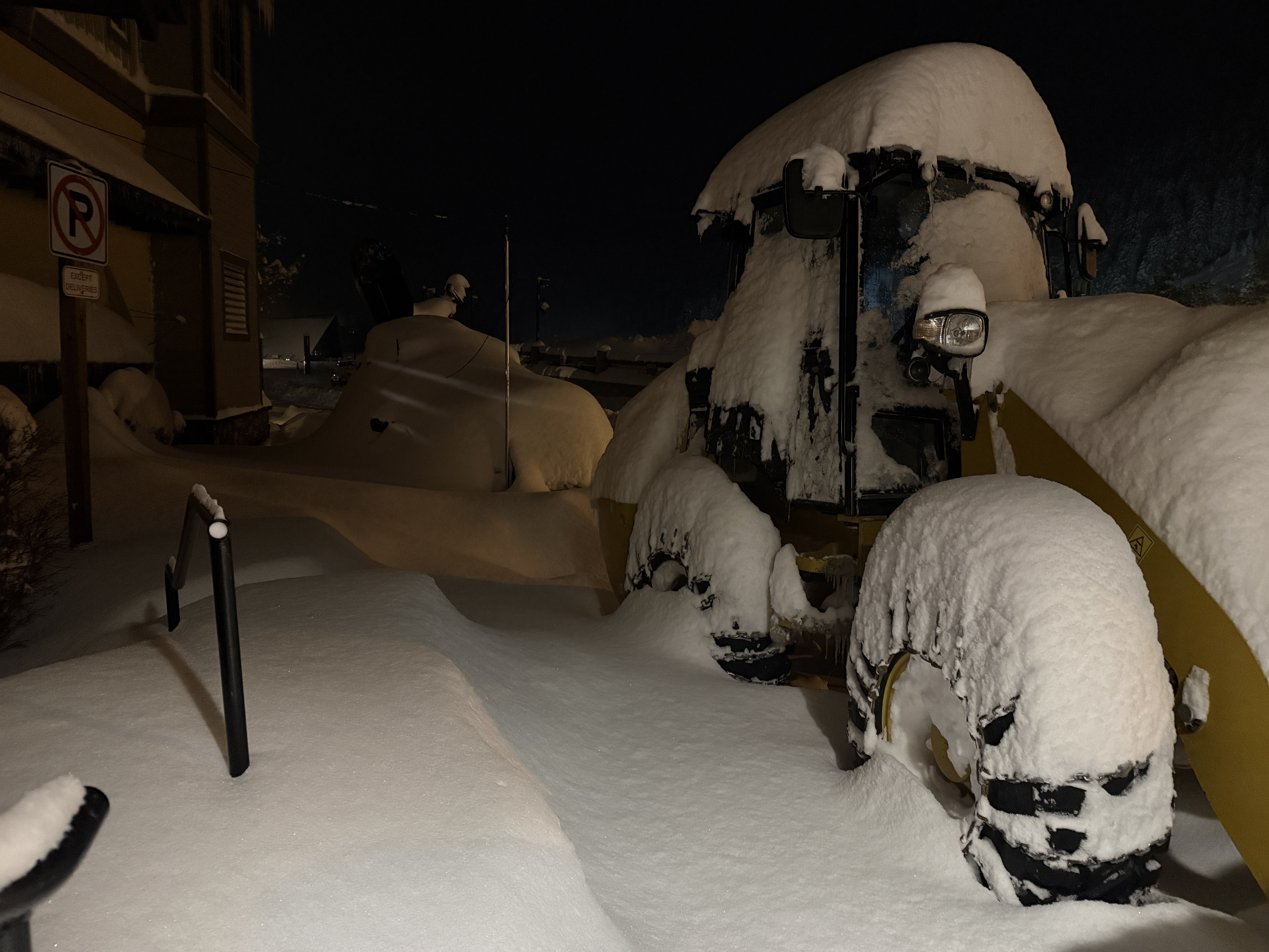 The image depicts heavy snowfall covering construction equipment, including a snow-covered backhoe loader. No active construction activities are in progress, and the site is in a winter storm condition. Visibility is low due to significant snow accumulation, impacting operational capabilities.