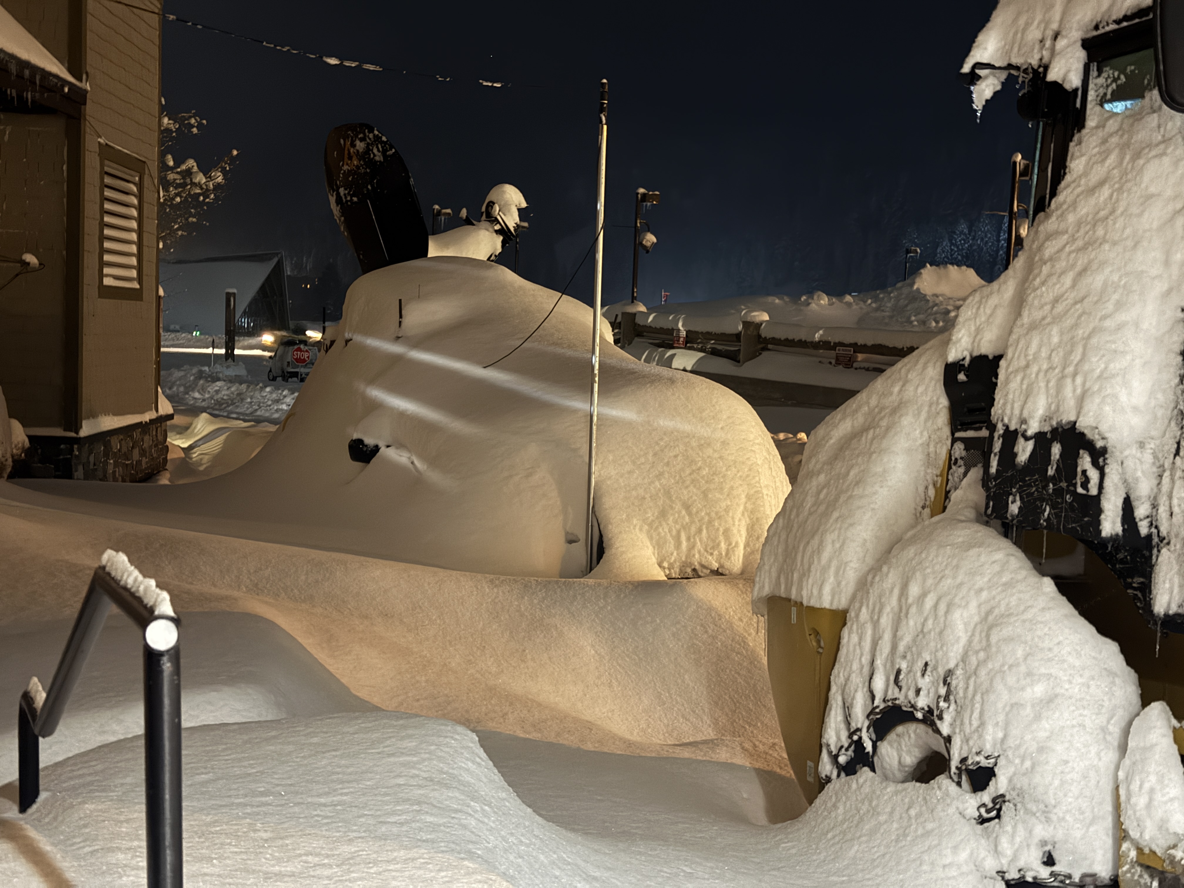 Mid-construction with significant snow coverage, nighttime conditions impede current activity, equipment staging is affected by storm impact.