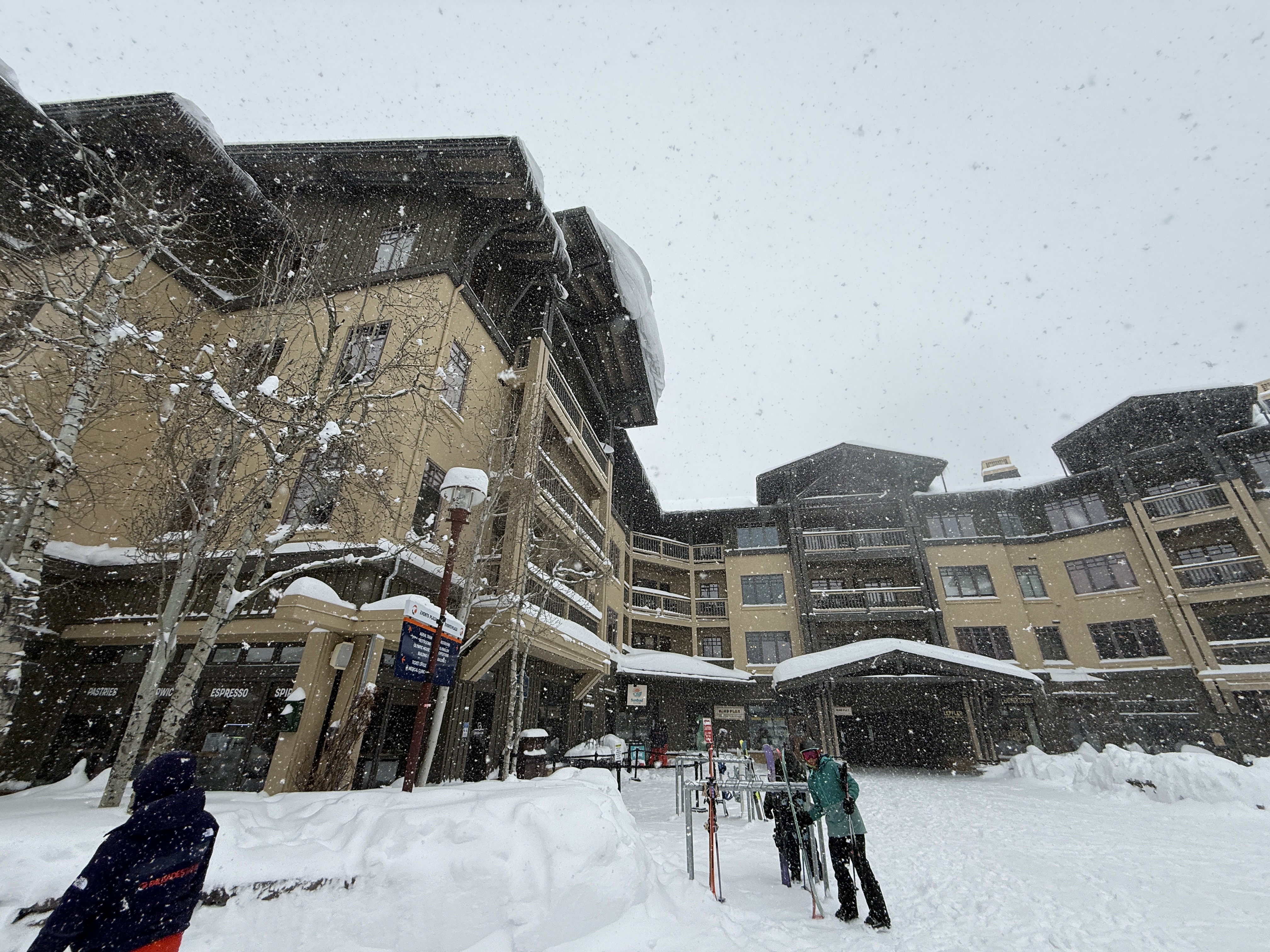 The image shows a large building complex during heavy snowfall, possibly at a ski resort, with no visible active construction work. The area is covered in snow, and individuals are present near ski racks, carrying ski equipment. No specific construction materials or components are visible, and the site does not appear to be in an active construction stage.