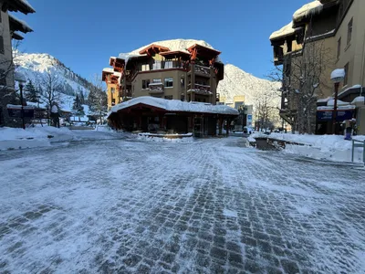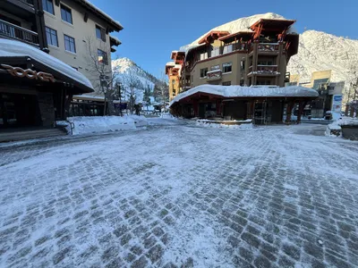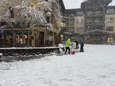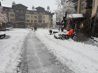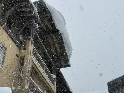 The image shows a residential building structure covered in snow, with heavy snowfall in progress. The roof appears to have a significant accumulation of snow, suggesting the need for snow removal activities. There are no visible signs of active construction or water infrastructure work being performed.