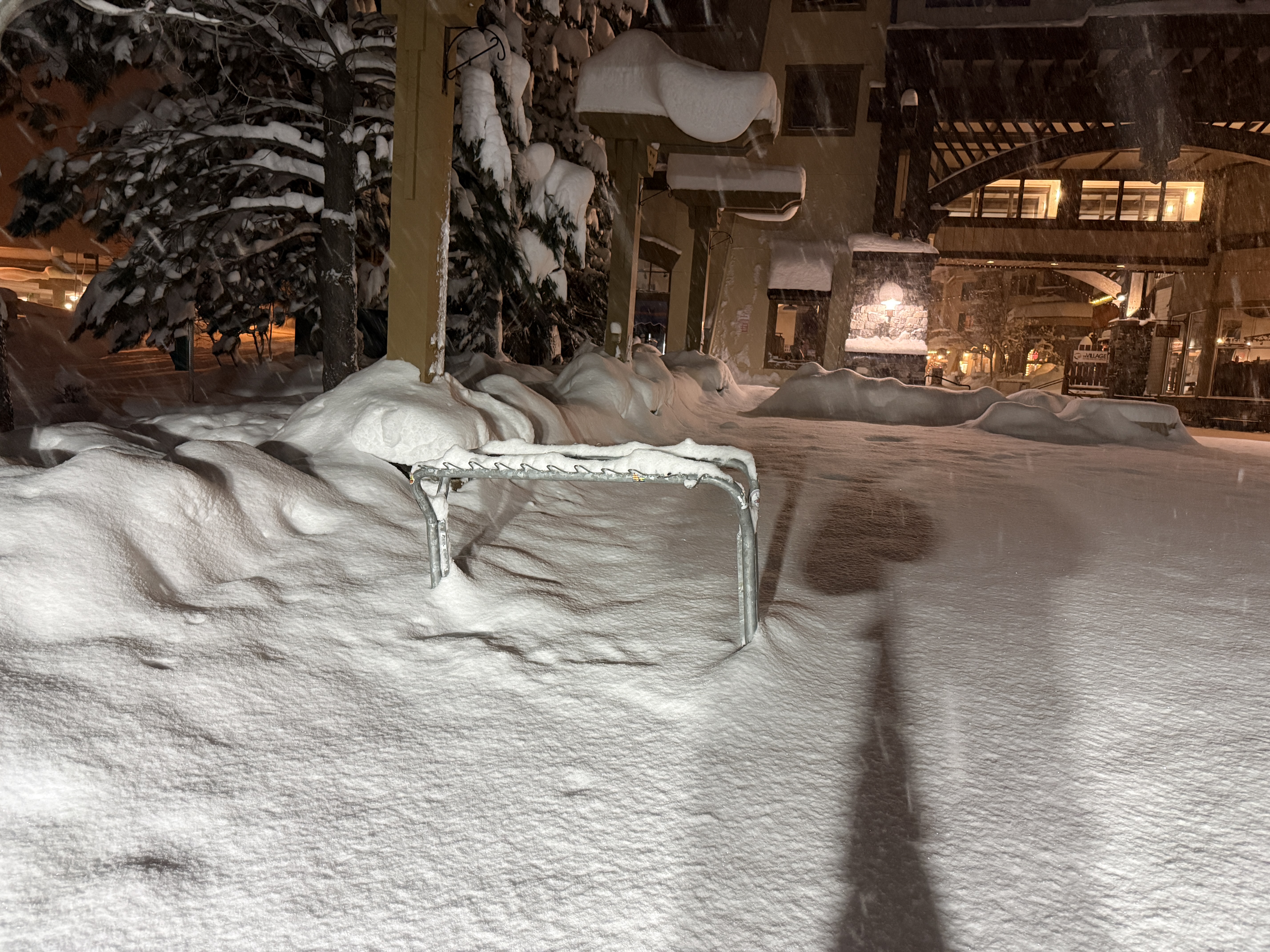 The image shows a snow-covered area with significant snow accumulation. No active construction activities, materials, or components are visible due to the snow cover, suggesting halted operations. The location appears to be in a public-facing area, possibly near a building or complex entrance, which is evidenced by visible architectural elements in the background.