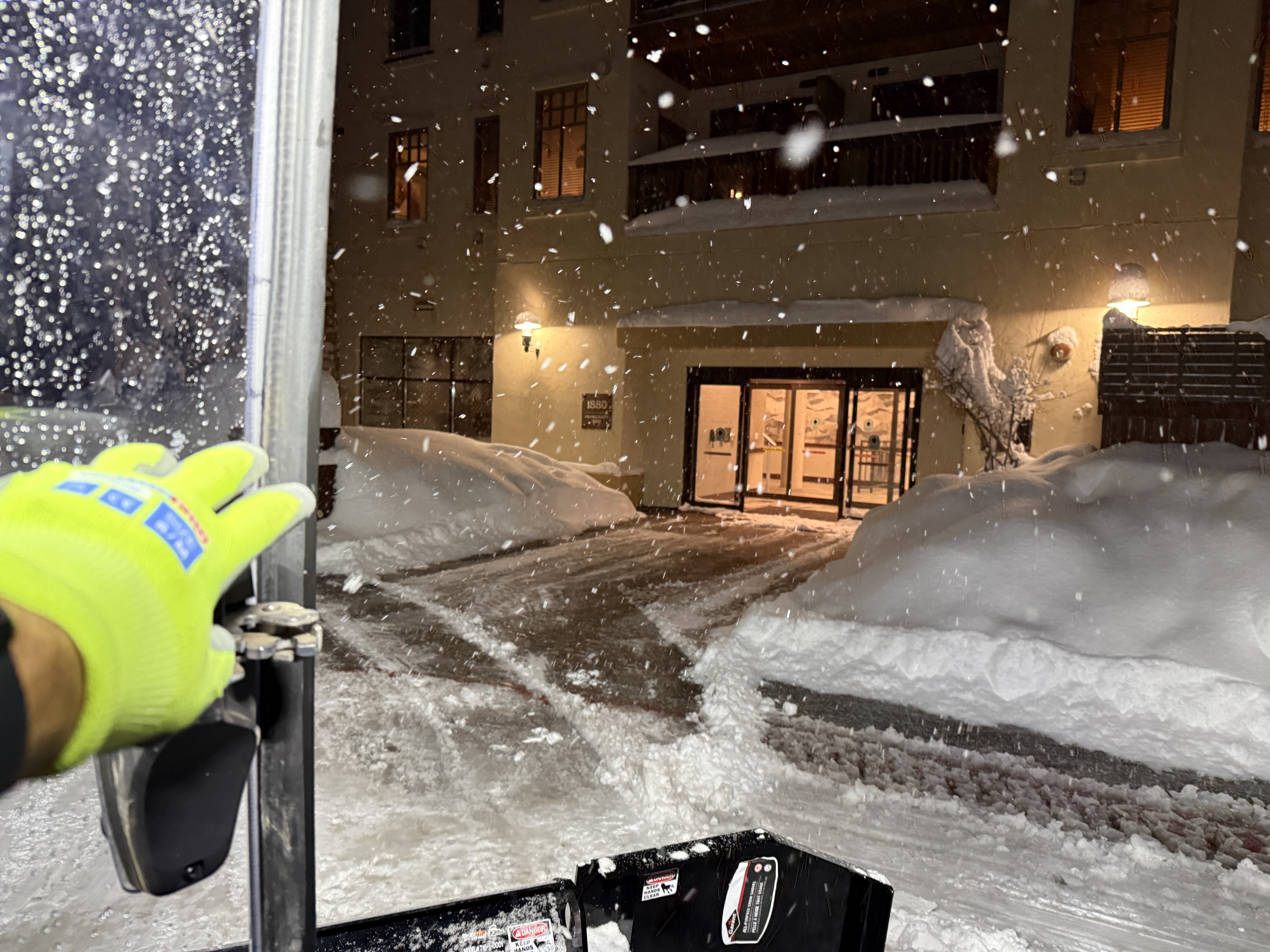 The photo shows active snow removal operations in a snowy environment outside a building entrance during a storm. A person is operating machinery to clear freshly fallen snow, as evidenced by the visible path being cleared. Significant snow accumulation is present on the sides, indicating ongoing snowfall and heavy accumulation.