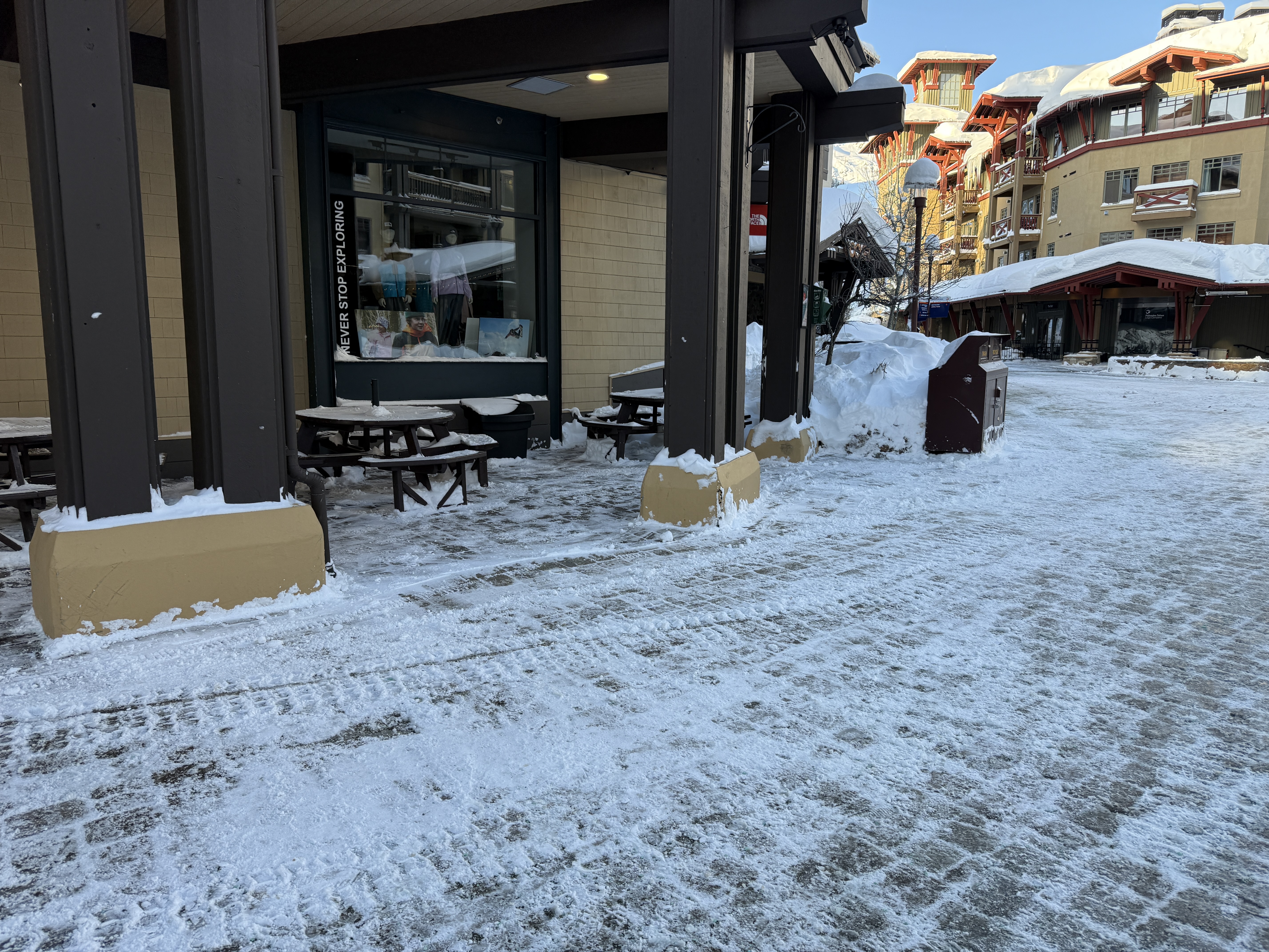 The photo shows snow accumulated on a cleared pathway with adjacent areas consisting of snow-covered surfaces around buildings. There are no visible construction activities or materials typical of active water infrastructure work. The setting appears to be an outdoor area with no significant construction progress evident, suggesting either temporary suspension or completion.