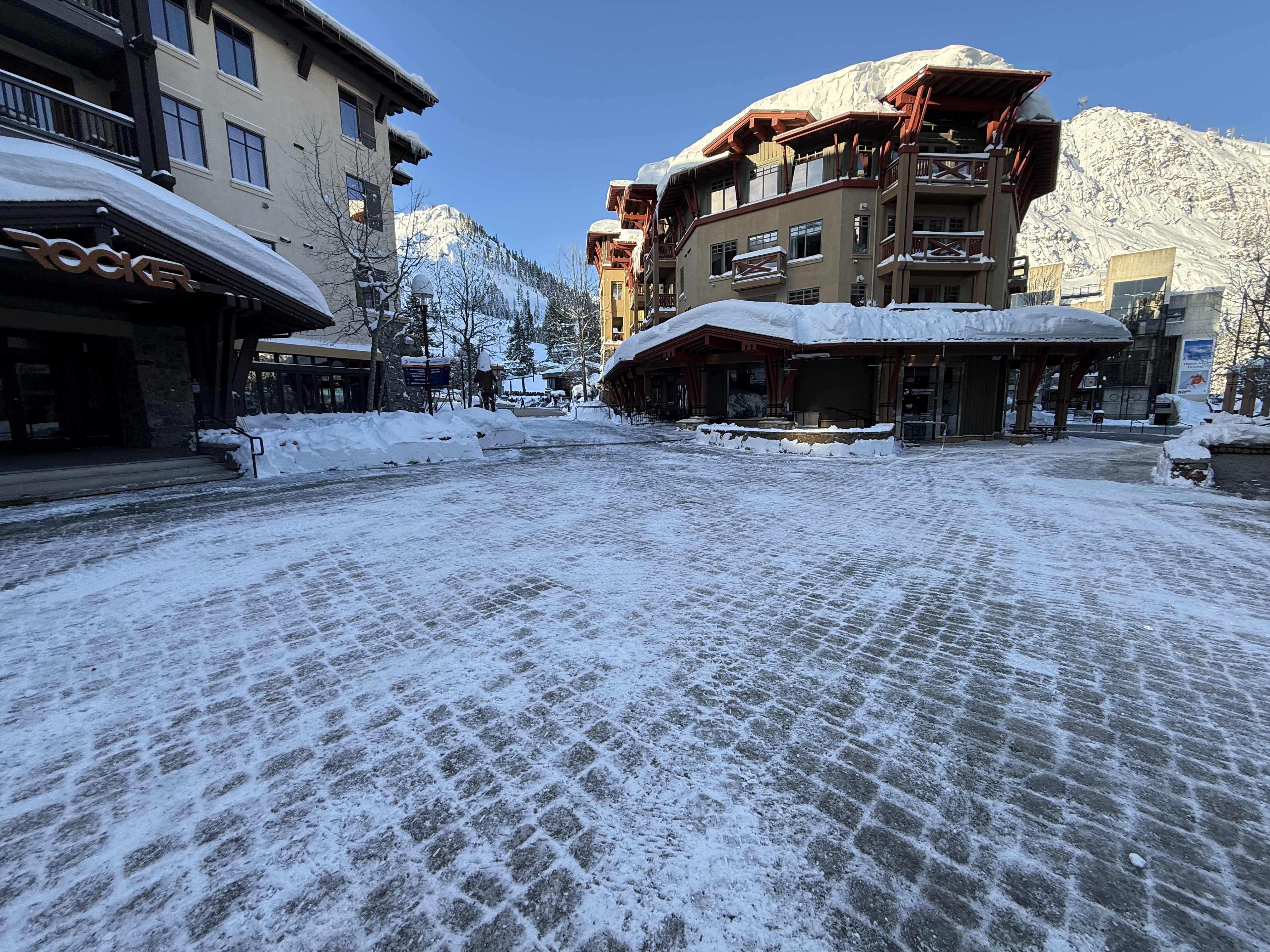 The photo shows a snow-covered open paved area surrounded by buildings, with no visible construction activity or materials present. The area appears to be at an early stage of surface preparation or maintenance related to snow removal. Notable site conditions include snow accumulation on the ground and rooftops.
