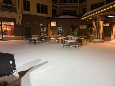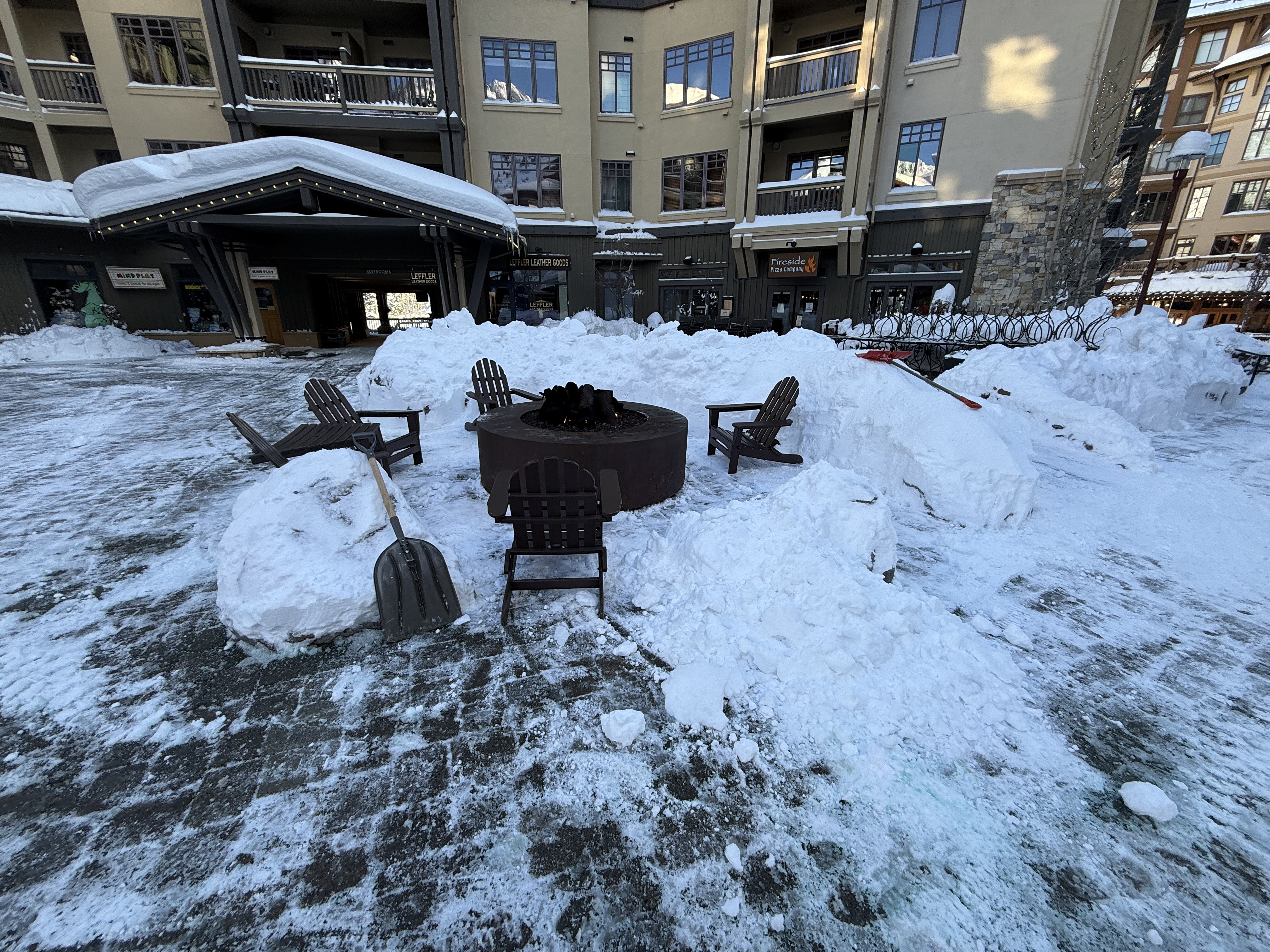 The photo shows a snow removal area with heavy snow accumulation around outdoor seating. Several Adirondack chairs are arranged around a fire pit, and shovels are present, indicating ongoing snow removal activity. The area is cleared on paved ground in front of a building, reflecting surface restoration efforts after a storm cycle.