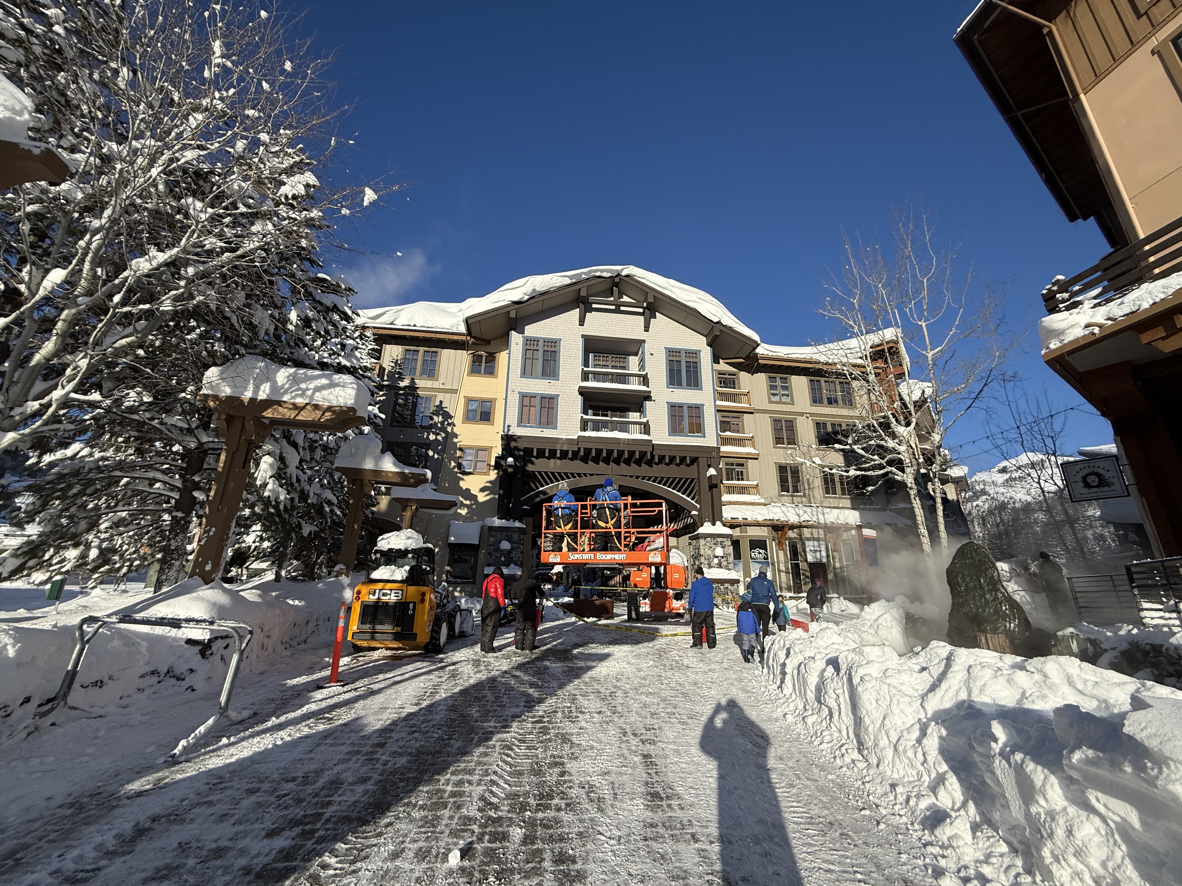 The image depicts snow removal activities in progress at a construction site in Olympic Valley, CA. There is a JCB compact loader equipped with a snowplow attachment being used to clear snow from the pathways. Additionally, a Skyjack scissor lift is present, which might be used for repairs or inspection on the building façade. The site is in an active snow clearance stage with visible equipment and workers engaged in snow management tasks.