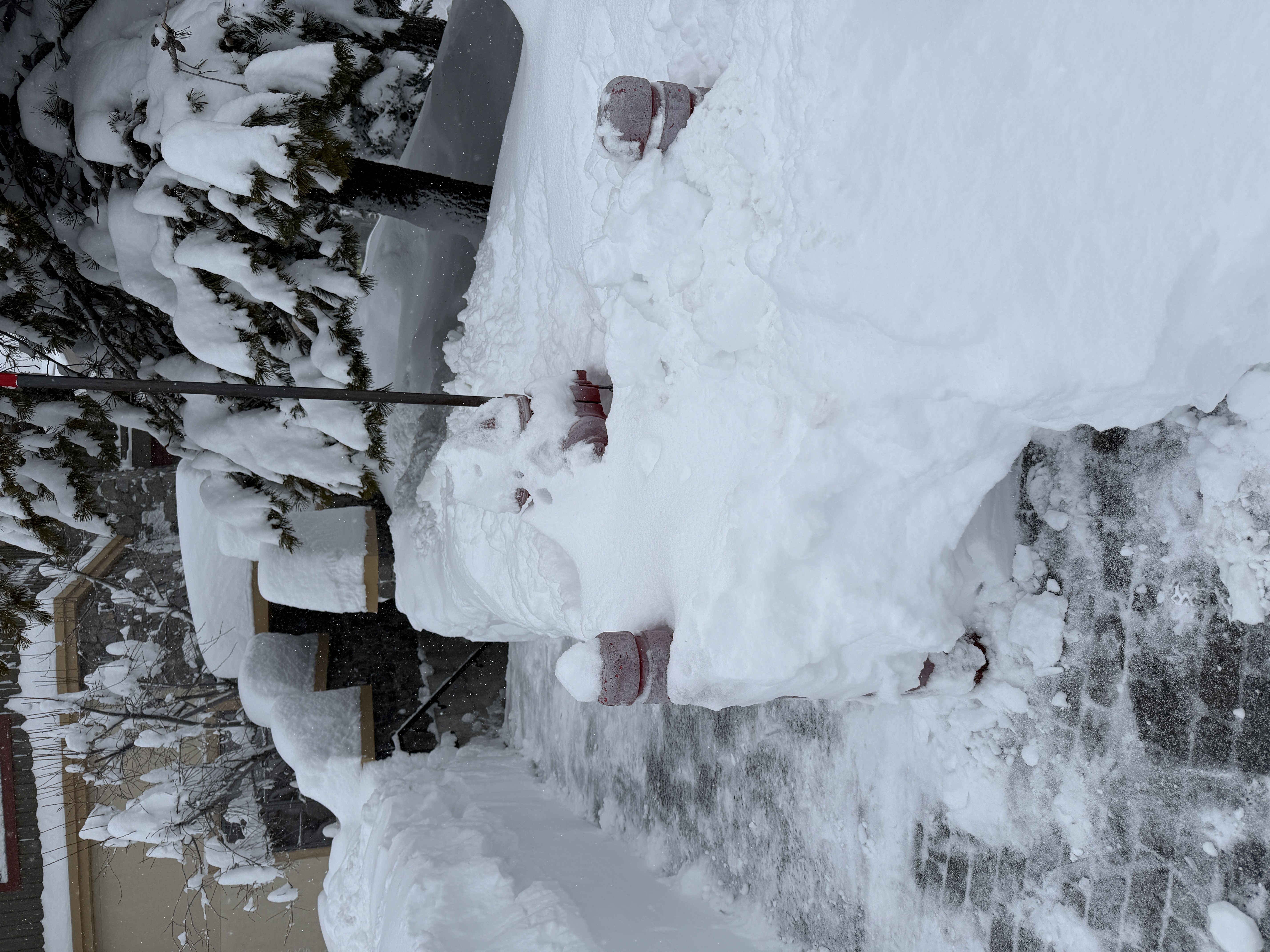 The photo shows a snow-covered path at a construction site with significant snow accumulation on nearby structures and trees. No active construction work or materials are visible due to the snow coverage, indicating this particular location is currently focused on snow removal rather than active construction work. The area is still in post-storm cleanup and snow management phase.