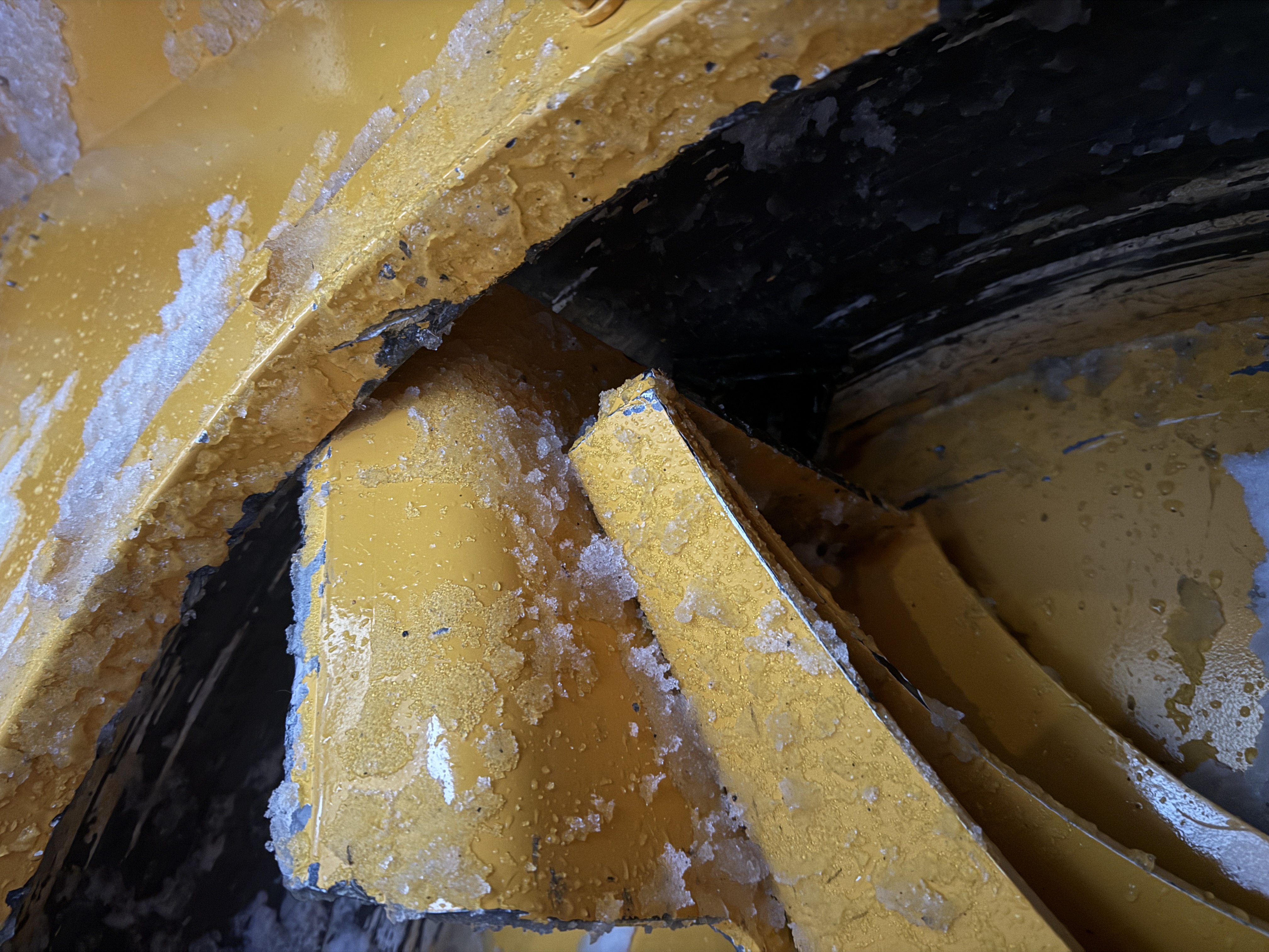 The image shows a close-up view of the internal components of a snow removal auger. The auger blades are coated with snow and ice, indicating active usage in snow clearing operations. The machinery appears to be in mid-operation of snow removal activities at the site, highlighting the presence of frozen precipitation being processed by the equipment.