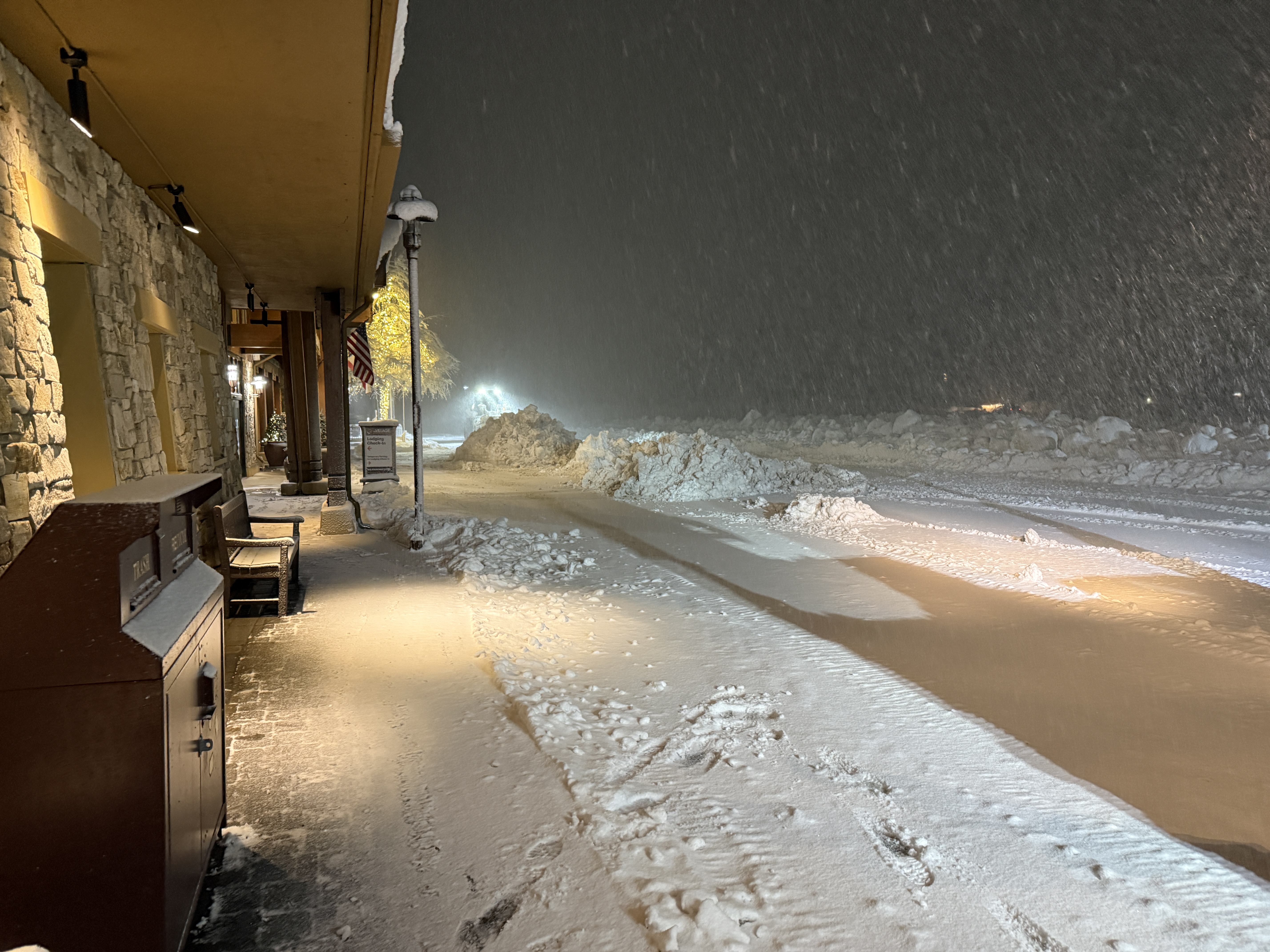 The image shows an accumulation of snow in an exterior area of a construction site, consistent with the first snowstorm at the location. While there are no visible construction activities or materials directly related to water infrastructure, the snow is being cleared, indicating snow management as part of site maintenance. The accumulation effects and lighting conditions suggest that active construction may be on hold.