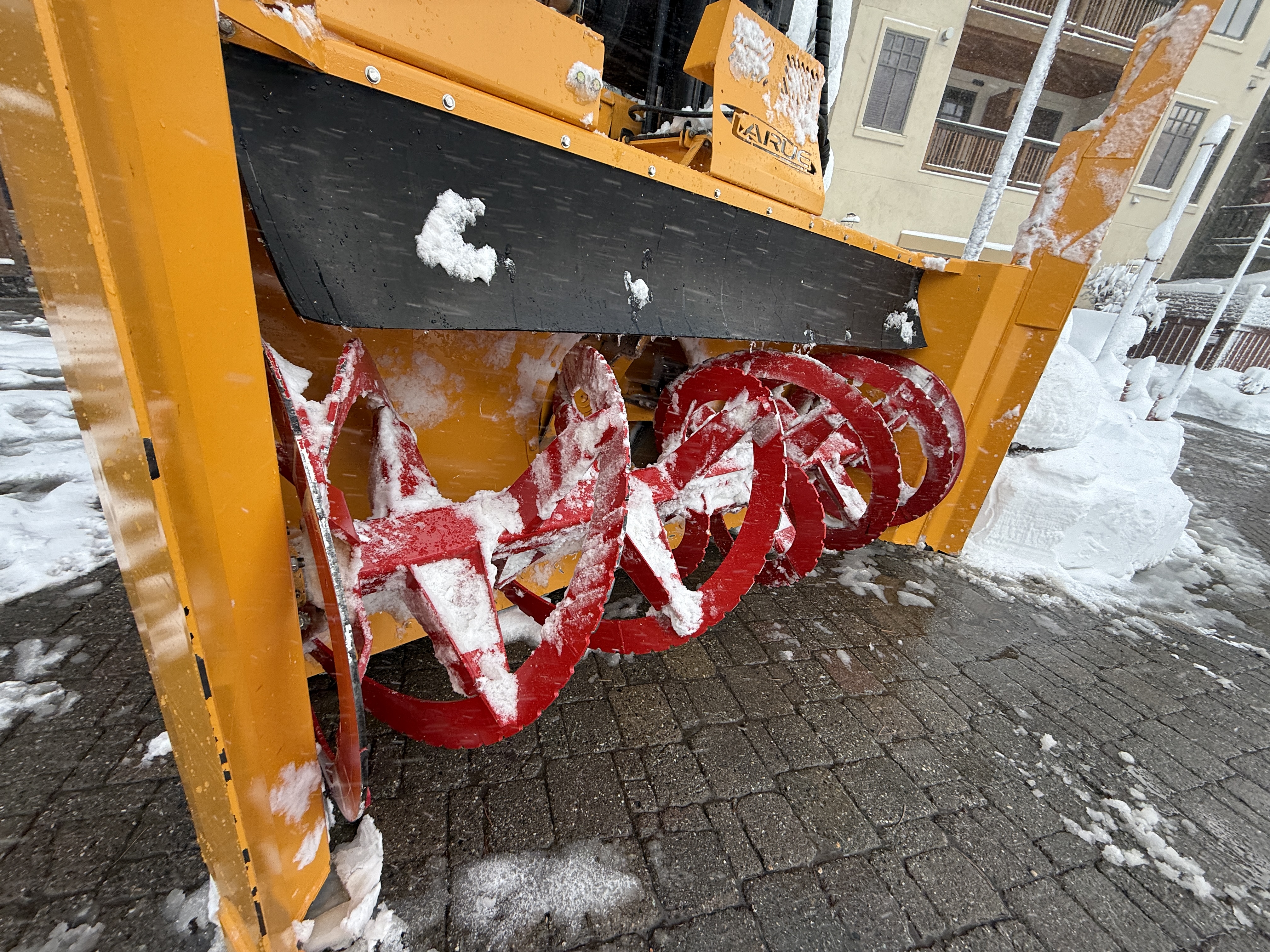 The photo shows a snow removal attachment mounted on a vehicle, featuring a large, red auger for clearing snow. The equipment is actively engaged in clearing snow, as indicated by snow buildup on the auger blades. The construction stage appears to be during the early snowfall management phase of the project. The area is experiencing snowy conditions with fresh snow on the ground, suggesting active snow management.