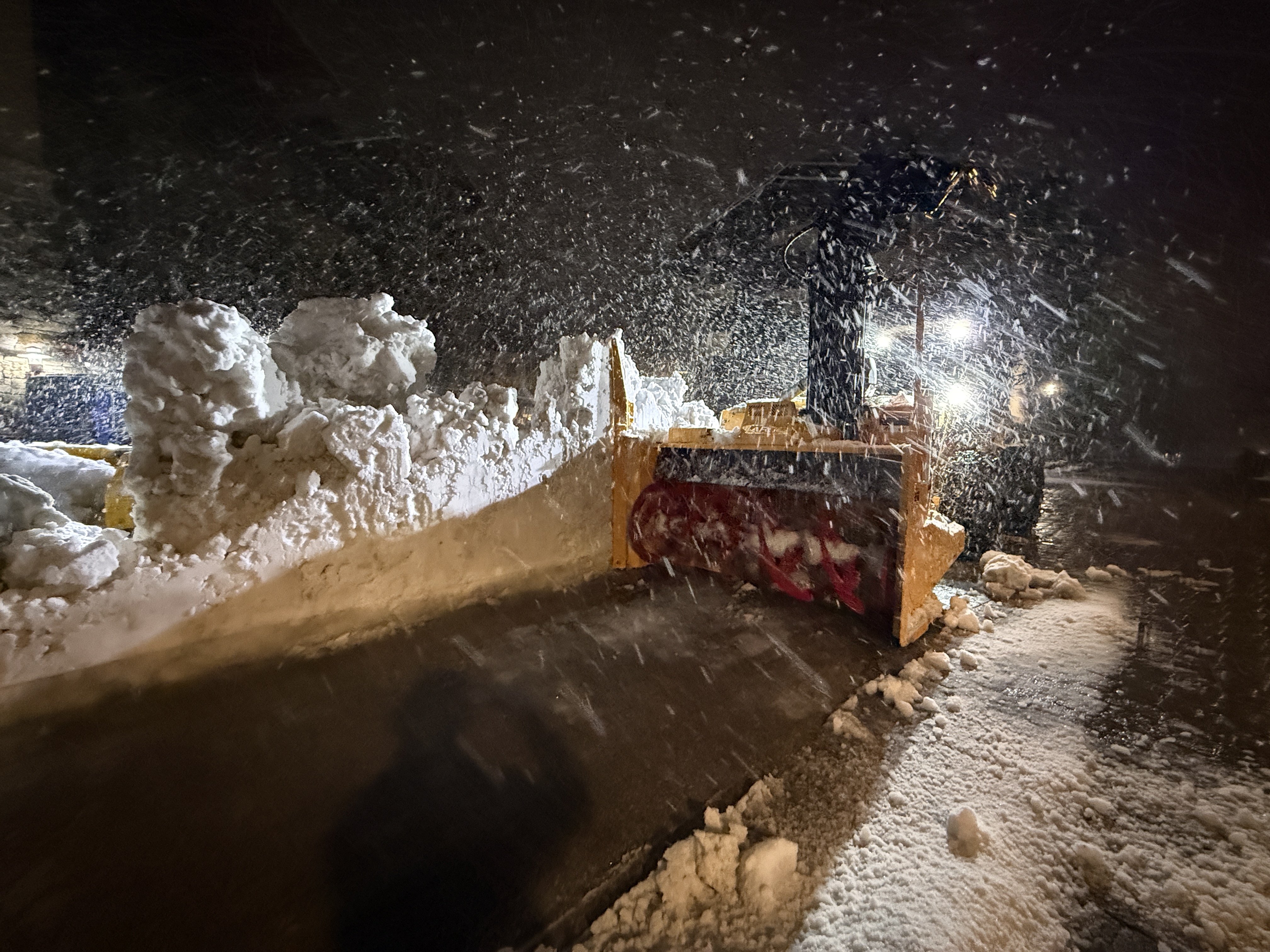 The site is in an active snow removal phase with nighttime operations under snowy weather conditions.