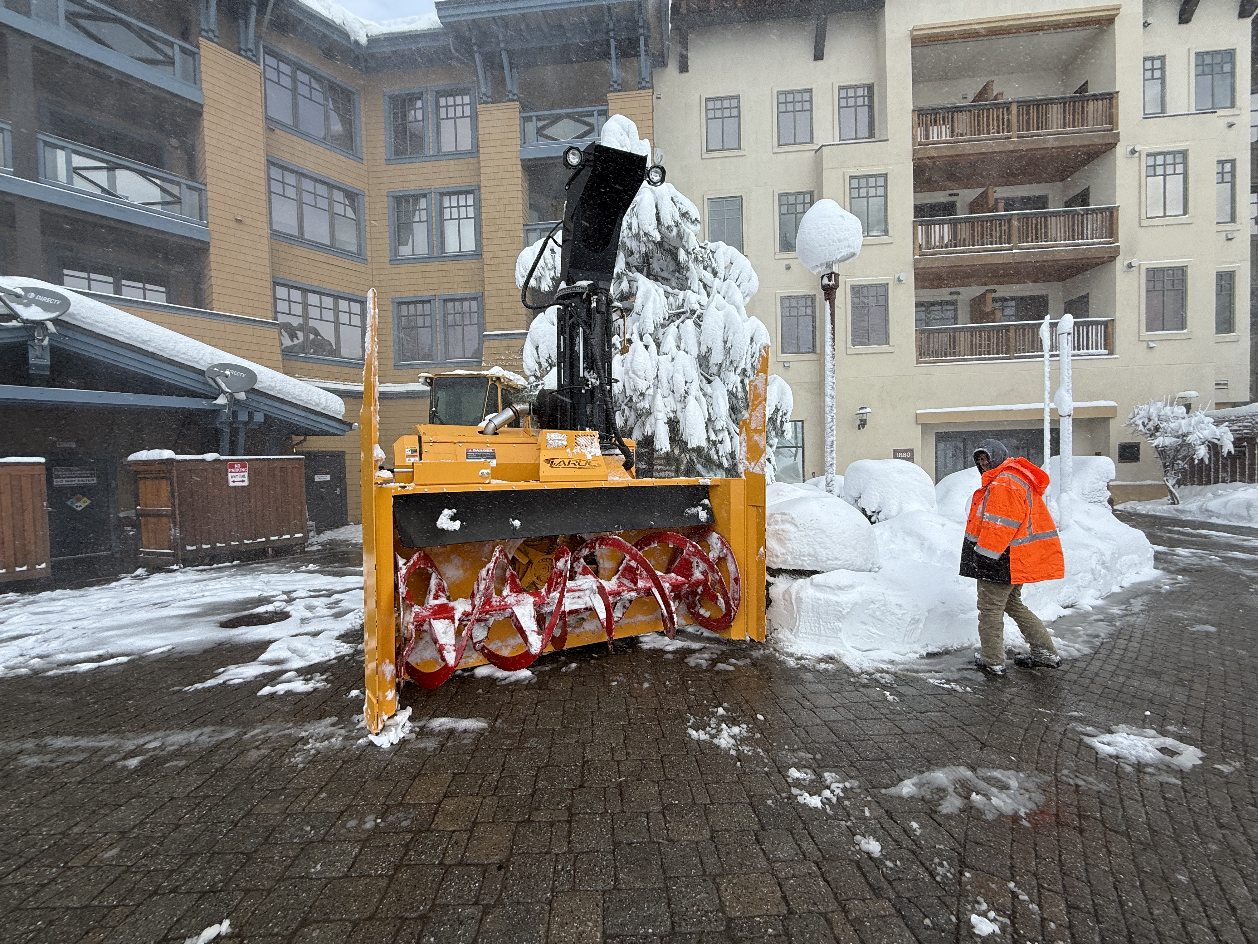 The photo shows an active snow removal operation with a heavy-duty snowblower clearing pathways in a snowy residential or resort area. There is accumulation of snow on the roofs and surrounding areas, indicating active snow management to maintain accessibility. A worker in high-visibility gear is present, overseeing the operation of the snowblower.