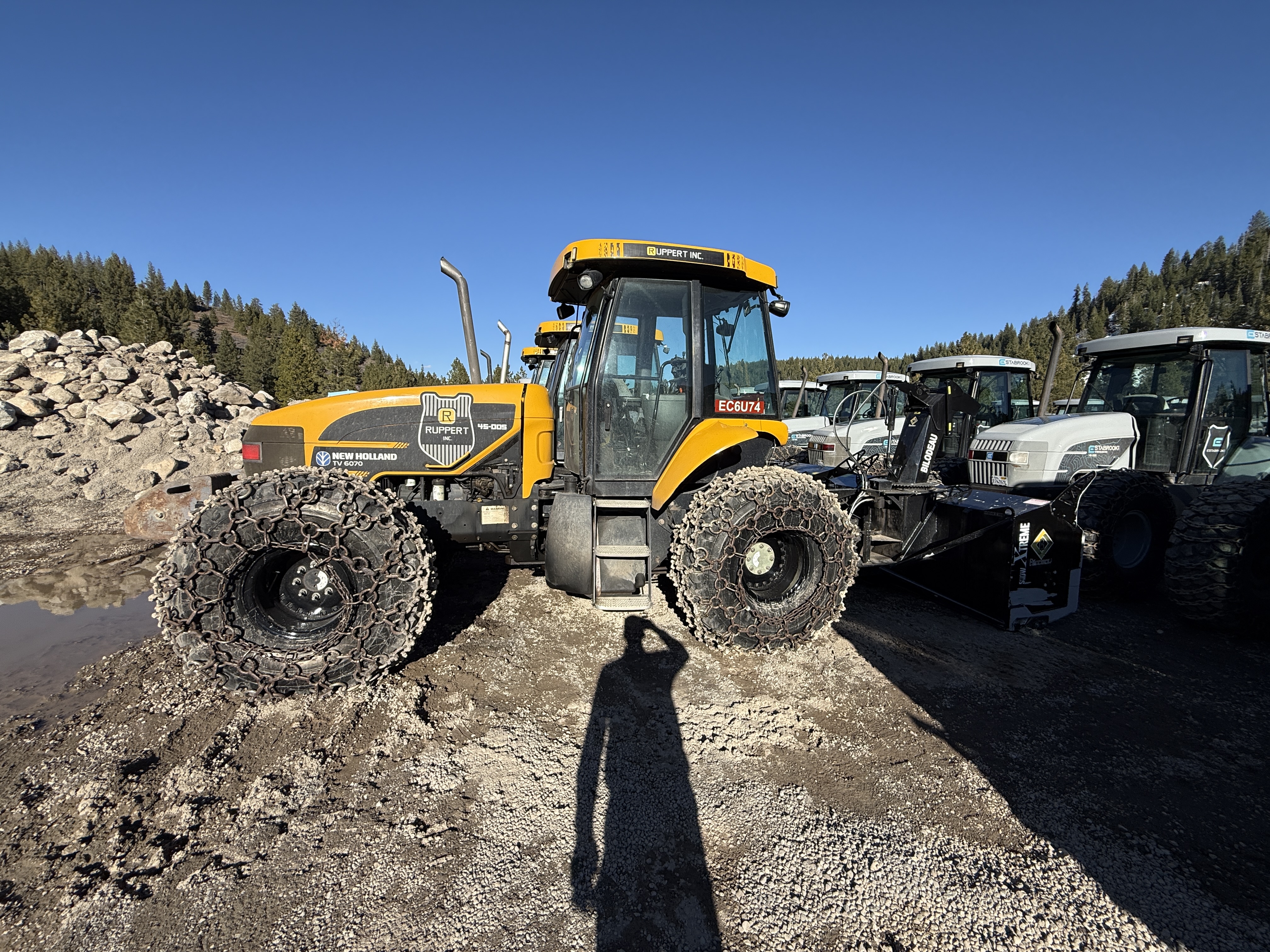 The photo shows a lineup of New Holland snow removal equipment with tire chains, indicating they are prepared for snow or icy conditions. The machinery is parked on a gravel and muddy surface, suggesting they are staged for upcoming operations. In the background, several similar machines are visible, indicating active staging for snow clearance tasks.