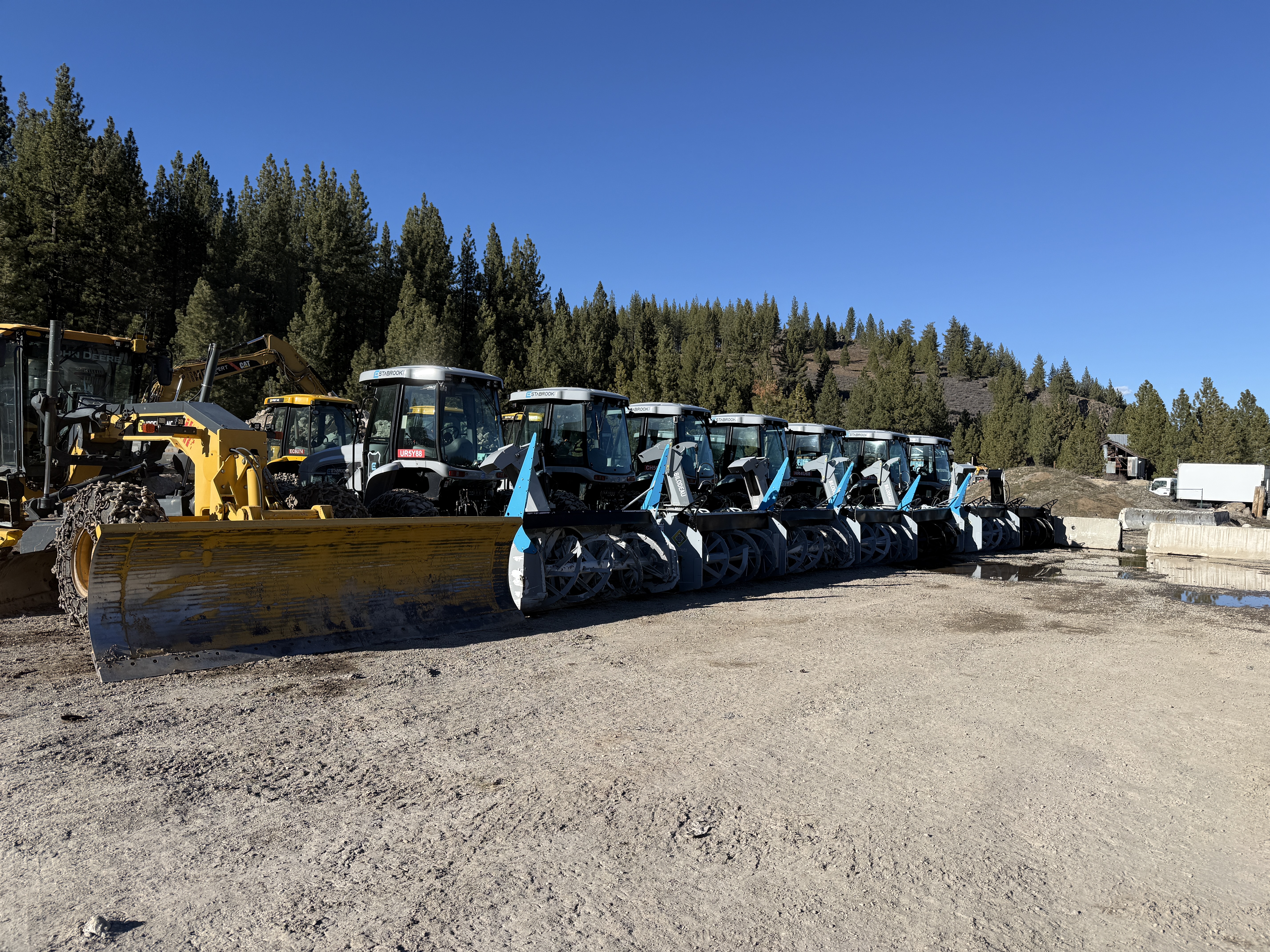 The photo displays a lineup of New Holland snow removal machinery, indicating equipment staging rather than active construction. The machinery includes snow blowers with large blades attached in a resting position, ready for mobilization. The site appears to be a preparation or storage area for snow removal operations, with multiple machines parked in alignment on a dirt surface.