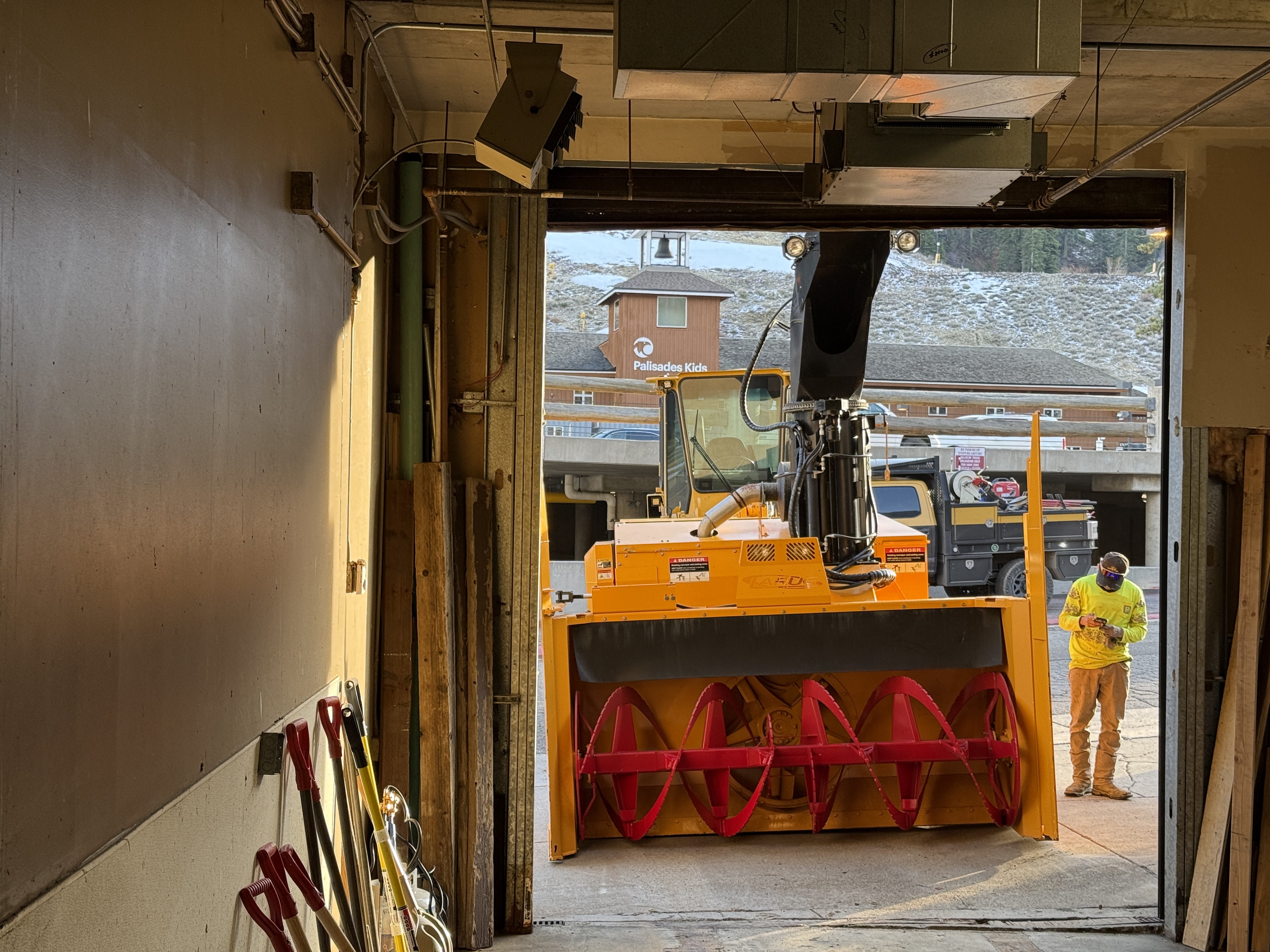 The photo shows a snow removal machine parked partly inside a garage with an engaged operator outside checking a device, possibly for inspection or calibration. The machine is equipped with a large auger for snow clearing, indicating equipment readiness phase. Notable items in the garage include stored materials and tools lined against the wall.