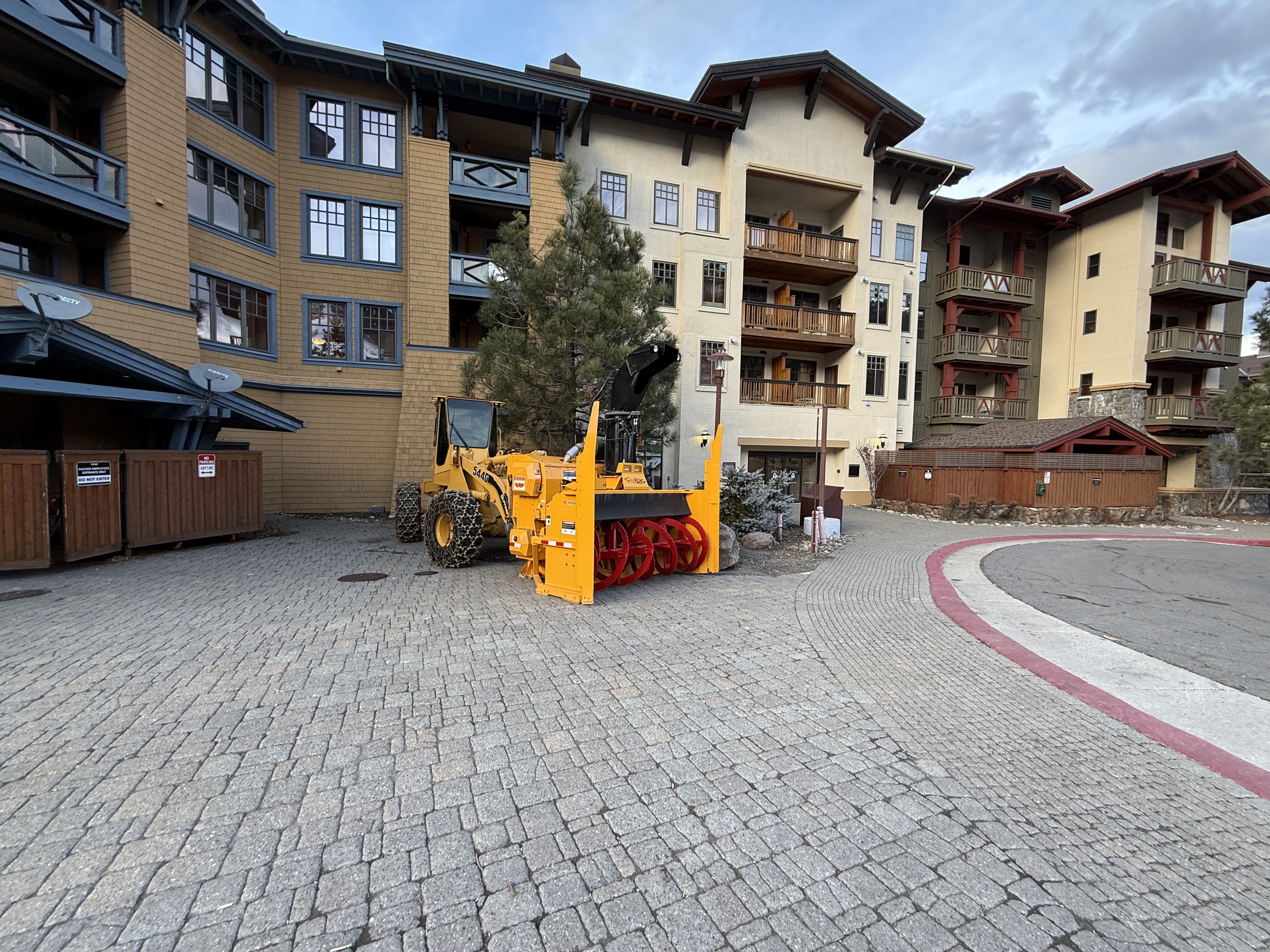 The photo shows a construction site with a snow removal machine positioned on a paved surface in front of residential buildings. No active construction activities are visible; the site appears to be in a staging phase with snow removal equipment prepared for deployment. The surrounding area is clear, and the equipment is parked without any evident construction materials or components being used.