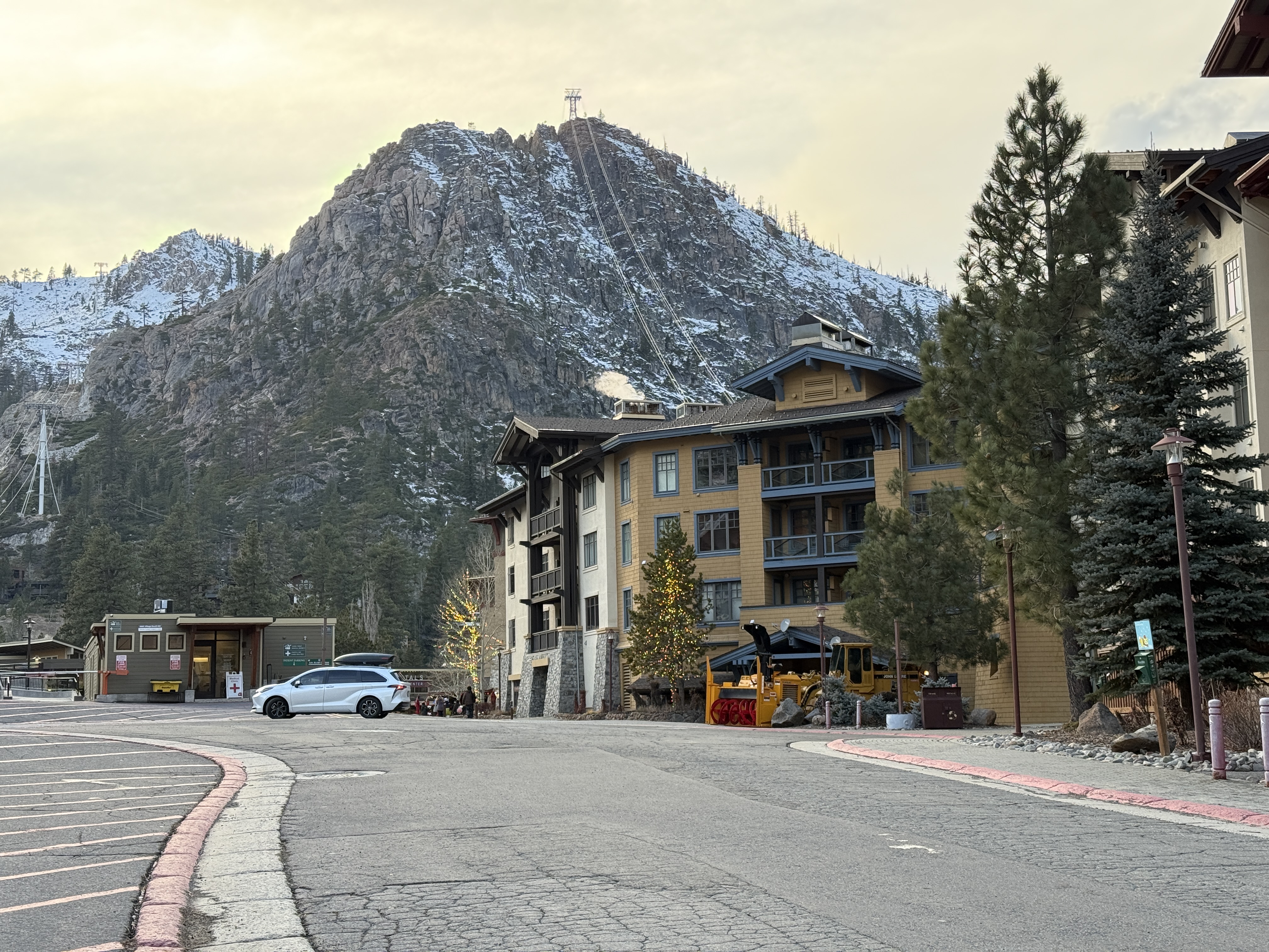The image shows a mountainous area with some residential buildings, pine trees, and fresh snowfall on the mountain side. There is no active construction or water infrastructure project visible, but rather a calm, developed area near a mountain. Vehicles and a snow removal machine are parked near the building indicating preparation for snow management.